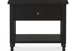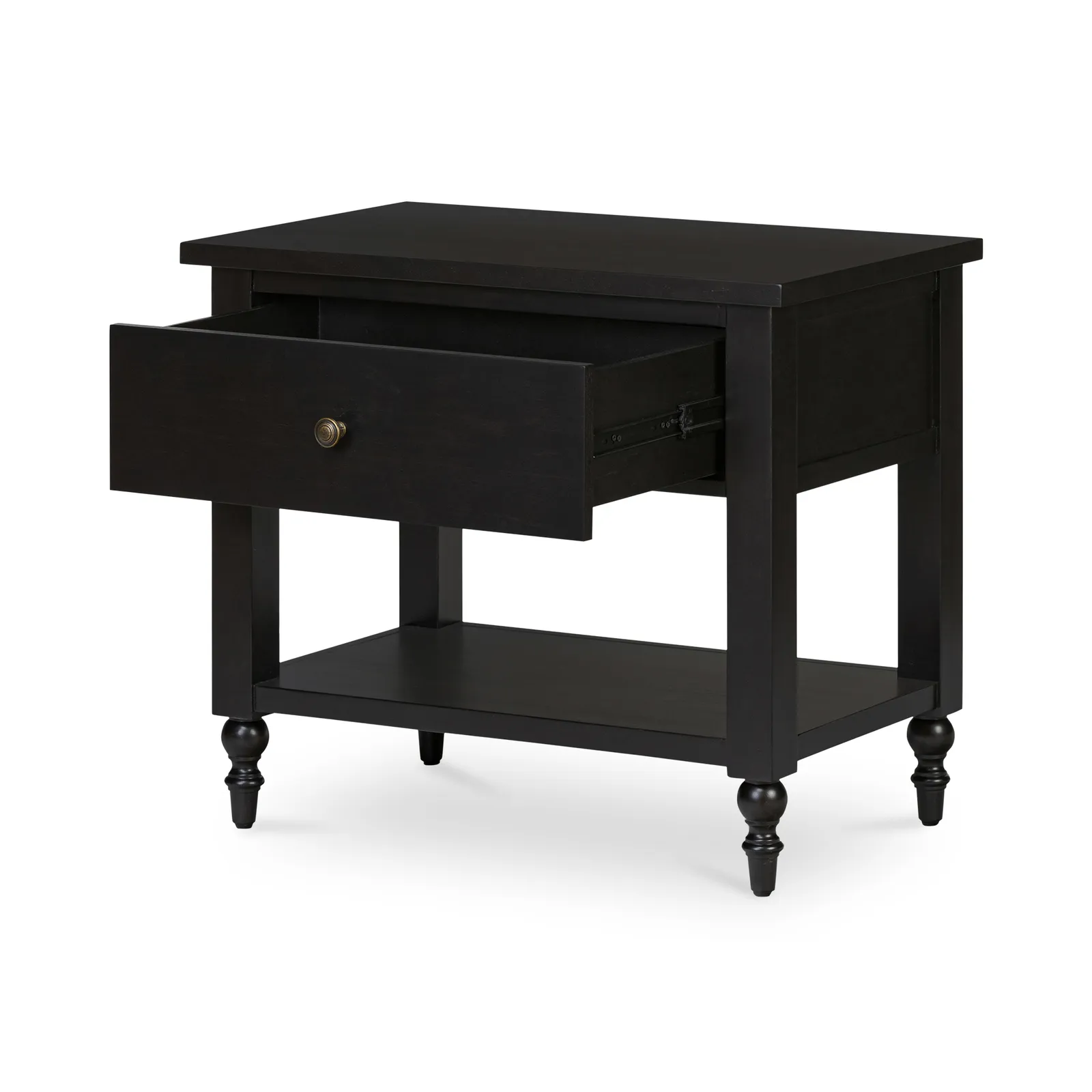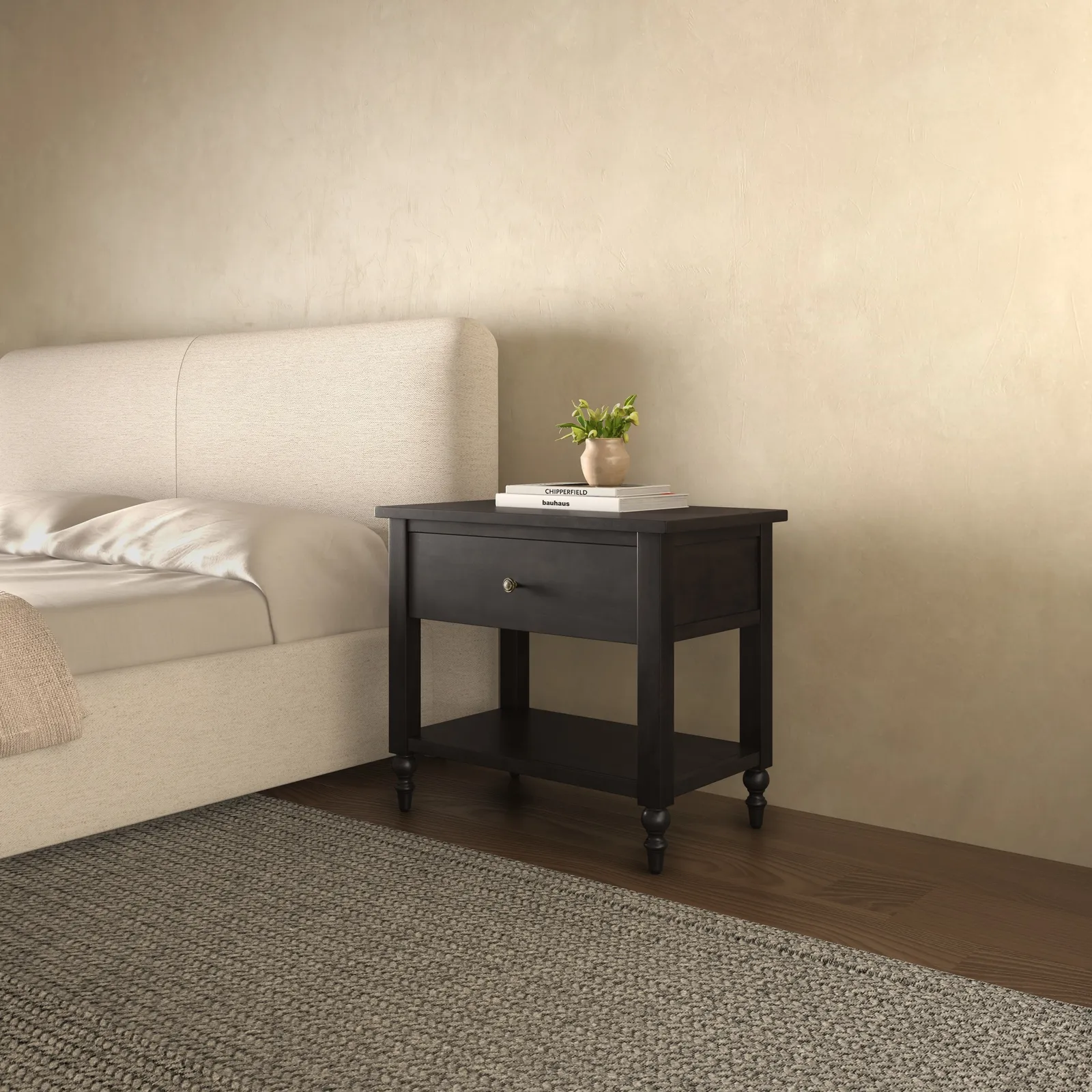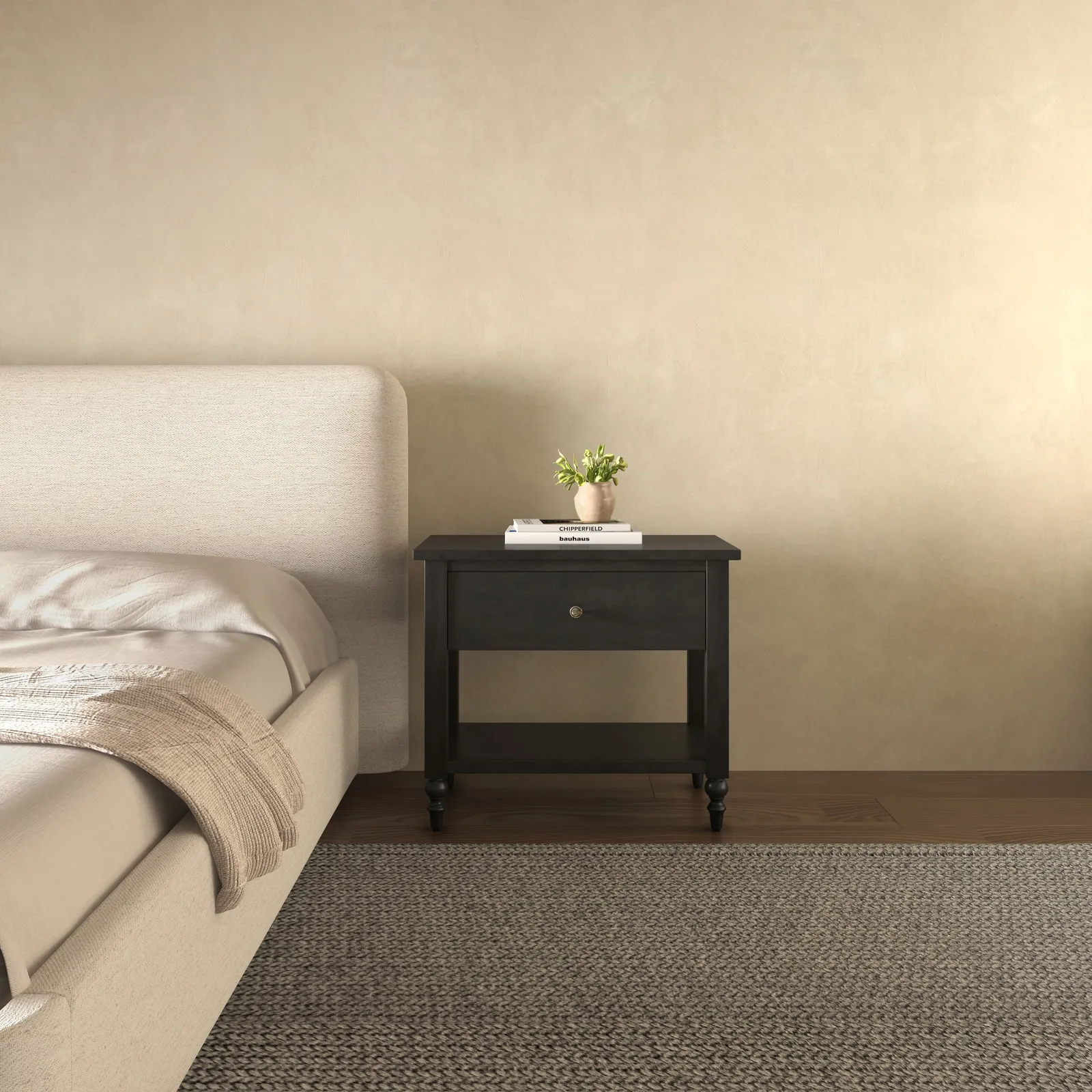 The Katherine nightstand features generous dimensions that offer ample drawer and open storage. Crafted from high-quality Acacia wood and complemented with Acacia Veneer, this piece promises lasting beauty with a statement of refined taste punctuated by the timeless elegance of the classic brass handle.