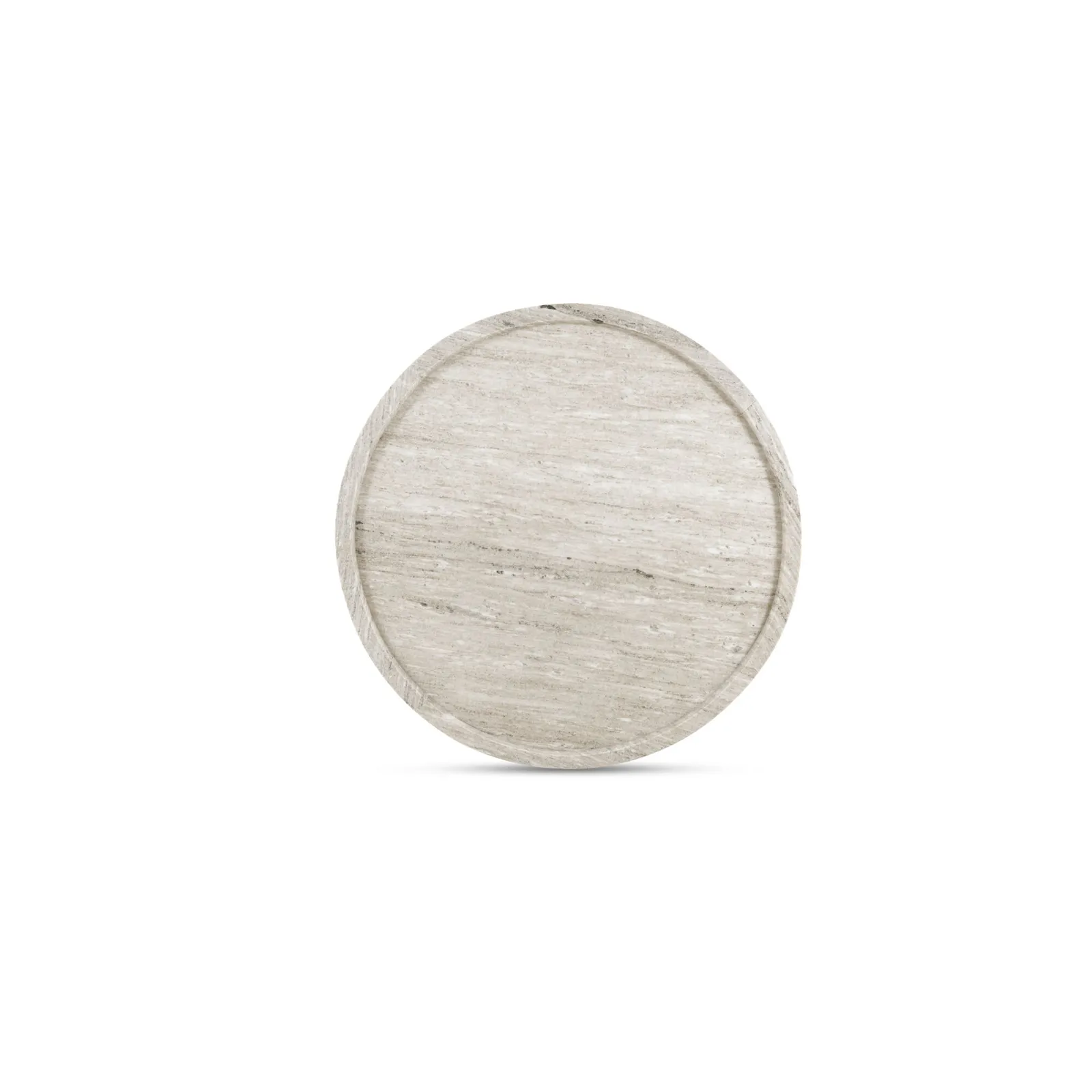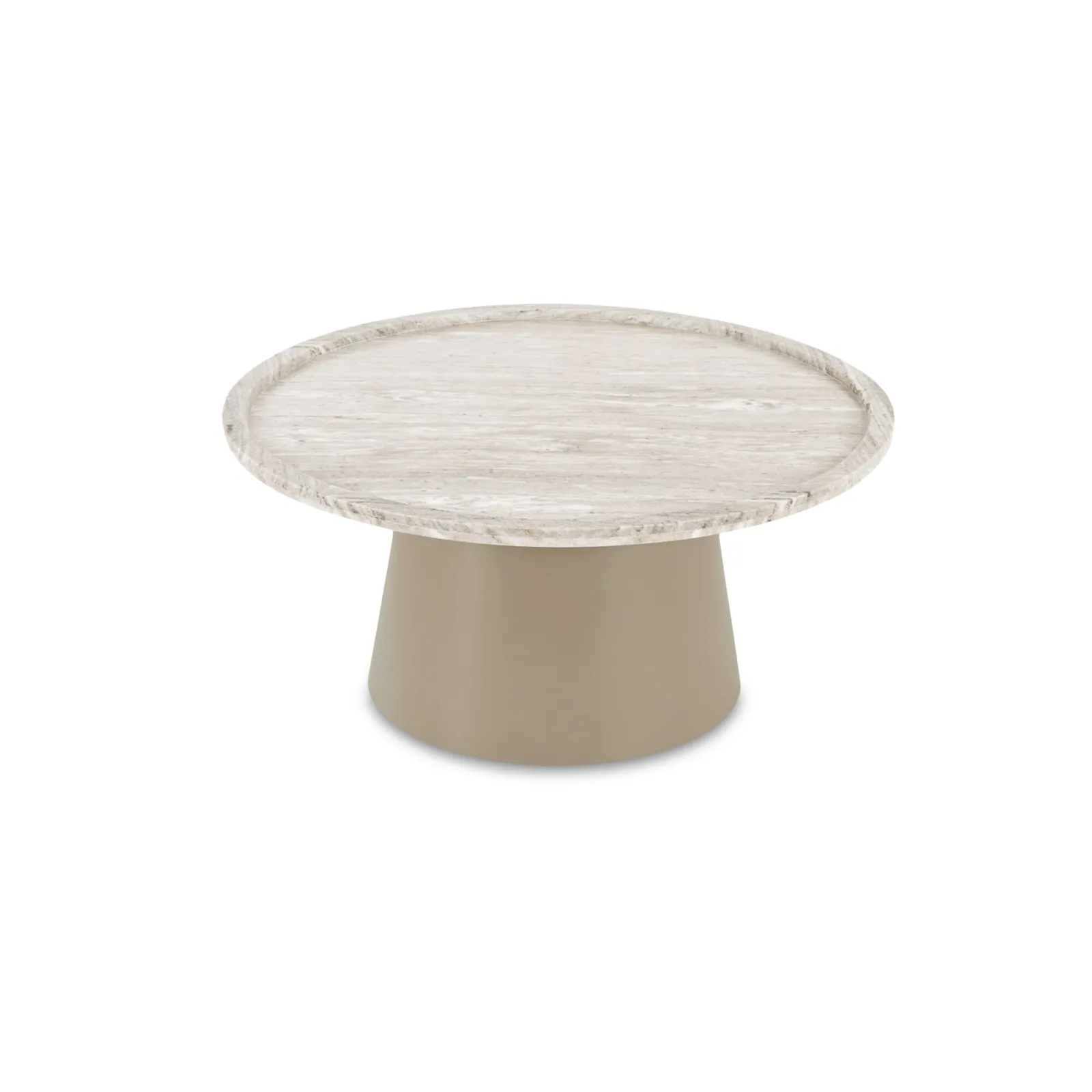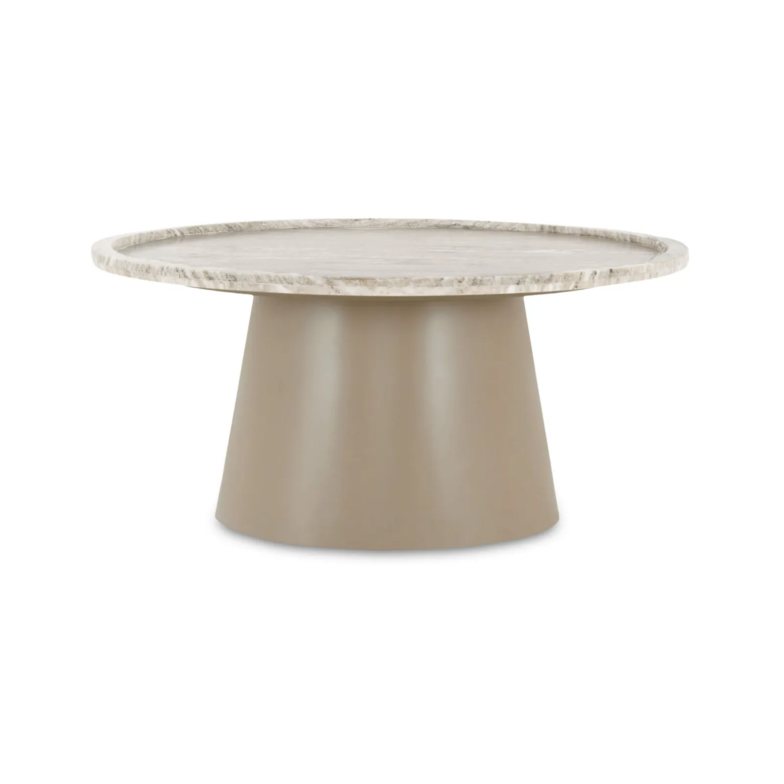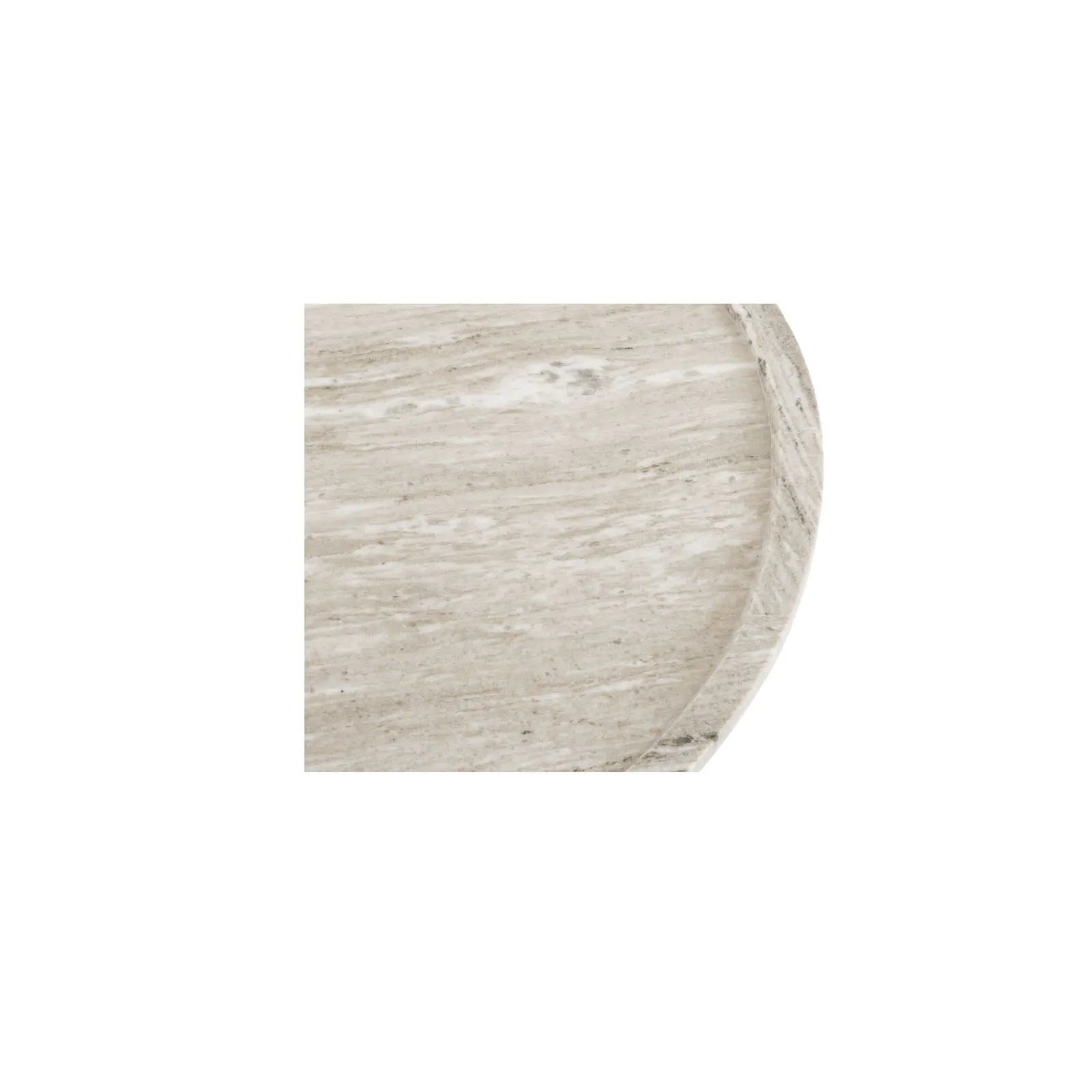 The Kimberley Coffee Table is a blend of cool materials and warm tones. A rounded tray-shaped top of antique white marble featuring subtle veining rests upon a camel-colored iron sheet base that angles outward with grace. This piece marries practicality with refined aesthetics—its tray top offer security; its design timeless appeal.