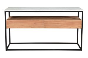 A marble marvel. The Kula’s tabletop is made of highest quality banswara marble, a perfectly smooth surface with all the individuality of the stone left intact. Kula’s solid acacia body features two soft-close drawers for all your storage needs while a sturdy iron frame supports its blocked silhouette. A marble marvel that embraces mixed materials.