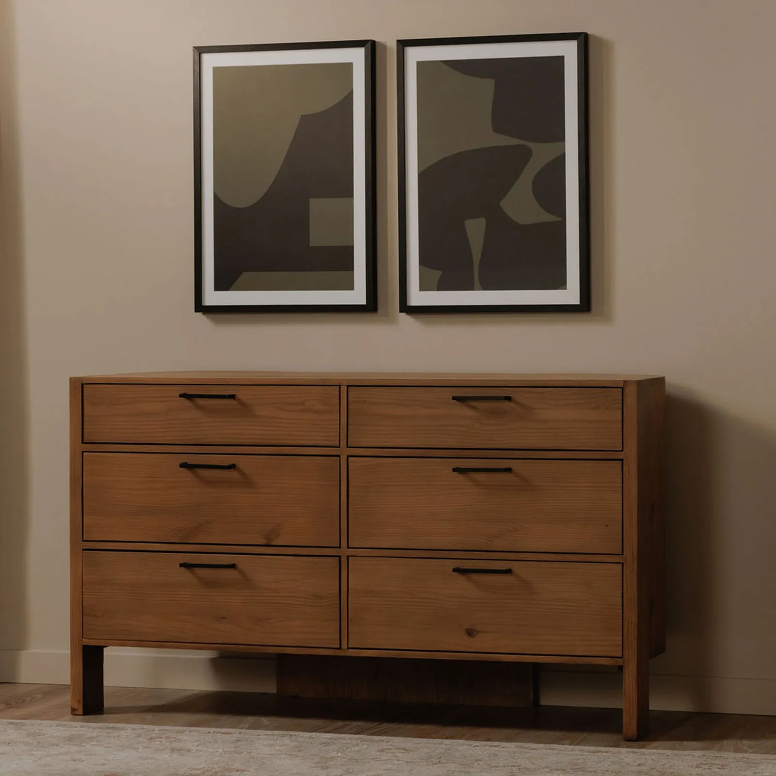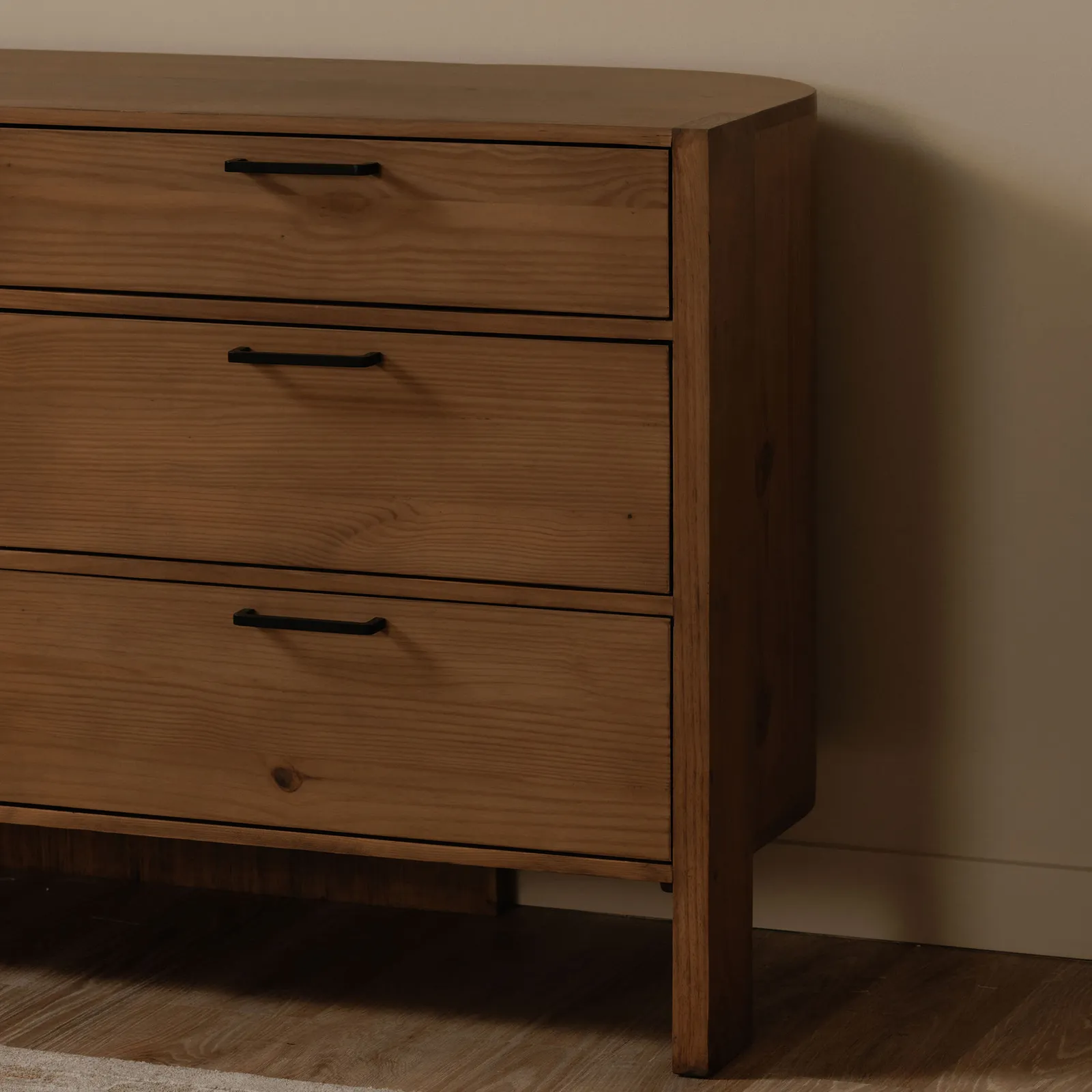 The Lachlan 6 drawer dresser adds a fresh twist to mid-century and Scandinavian aesthetics with its unique three-legged design and gently curved back. Crafted from pine, it features visible joinery for a touch of artisanal charm, punctuating its floating silhouette. The dresser has 6 soft-close drawers and is finished on all sides, ensuring both function and versatility go along with its sleek, modern lines.
