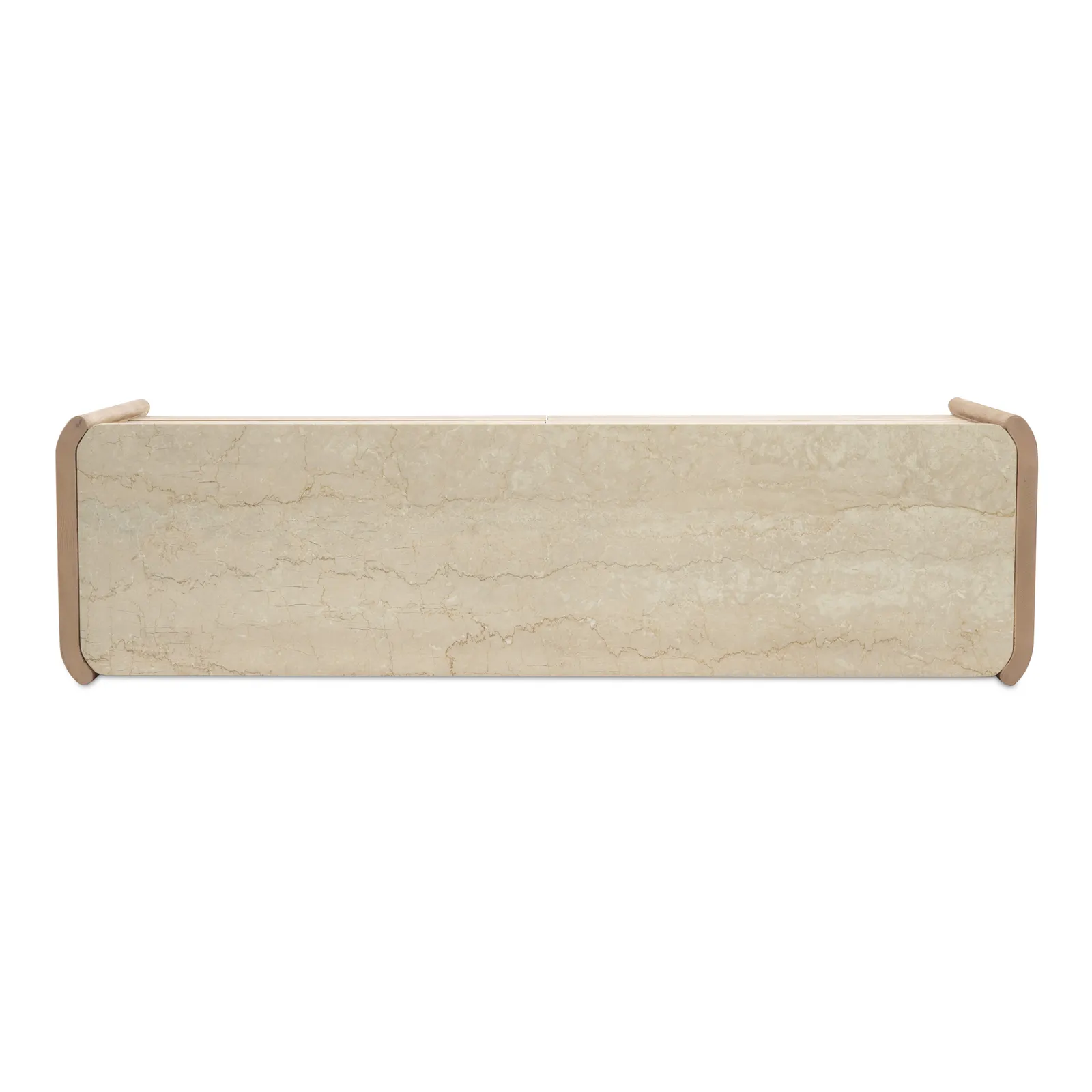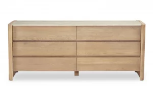 The Lane 6 drawer dresser captures the essence of Scandinavian modern design. Its sleek, solid oak frame is accented by thick, curved elements that soften its silhouette, allowing its inset Italian Botticino marble top to take centerstage as its rounded overhang gracefully complements its ample storage that features under-mounted glides.