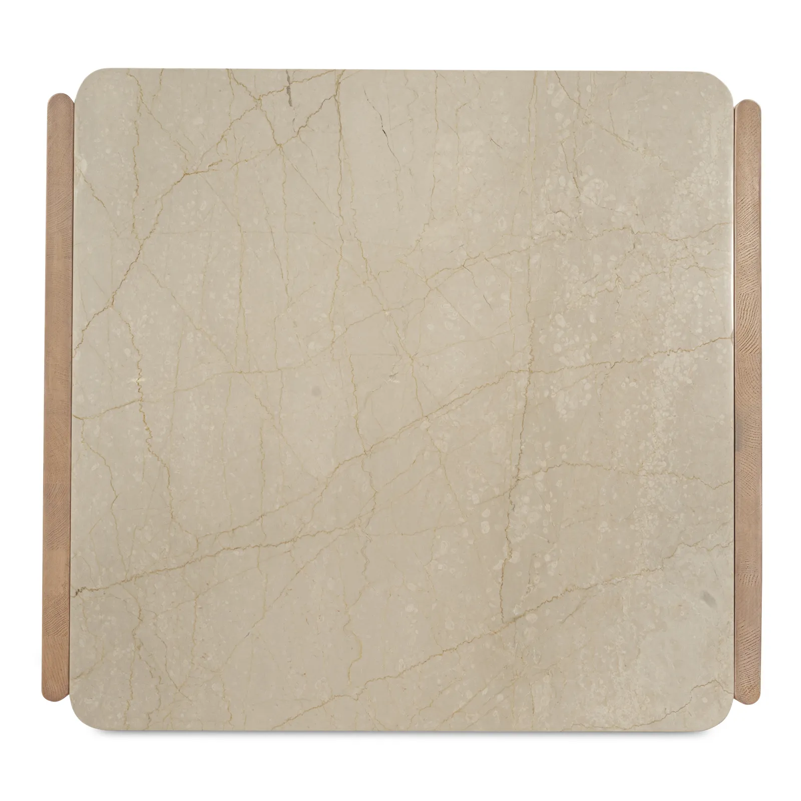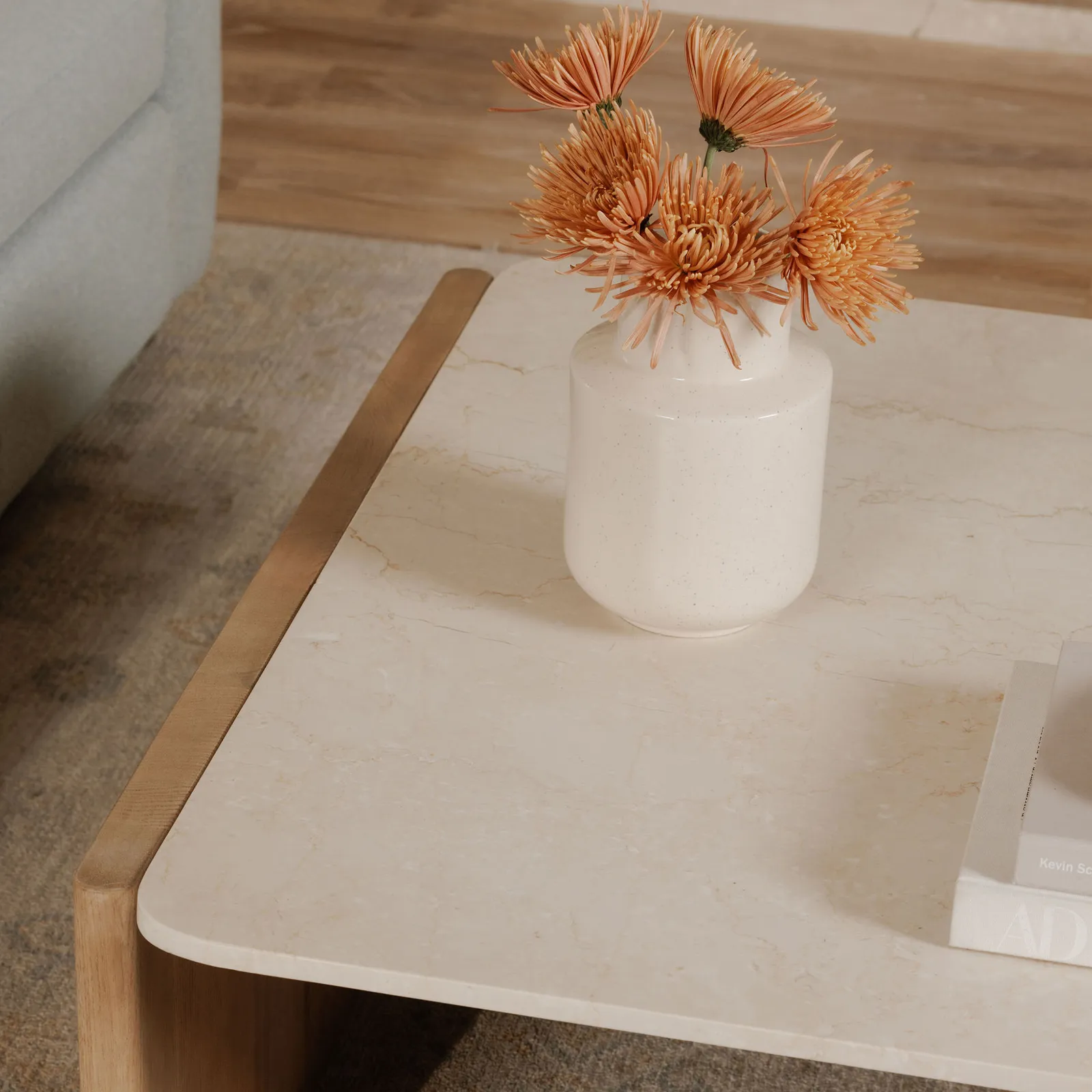 The Lane coffee table captures the essence of Scandinavian modern design. Its sleek, solid oak frame is accented by thick, curved elements that soften its silhouette, allowing its inset Italian Botticino marble top to take centerstage as its rounded overhang gracefully complements its solid oak legs.