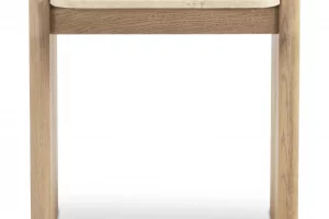 The Lane side table captures the essence of Scandinavian modern design. Its sleek, solid oak frame is accented by thick, curved elements that soften its silhouette, allowing its inset Italian Botticino marble top to take centerstage as its rounded overhang gracefully complements its solid oak legs.