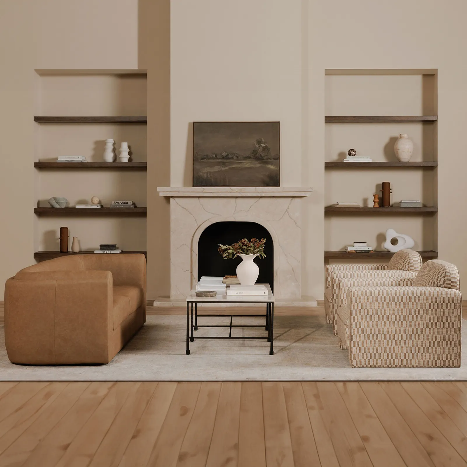 - Modern form that plays with curved & straight lines with a squared side profile contrasted against a curved back & arms