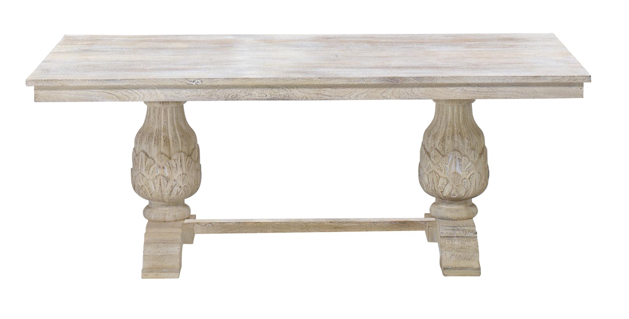 This handsome table is crafted,, using tongue and groove joint methods,, of mango timber in a water-resistant lacquer sealed whitewash finish. The two pedestals feature step feet and beautifully hand carved detail.