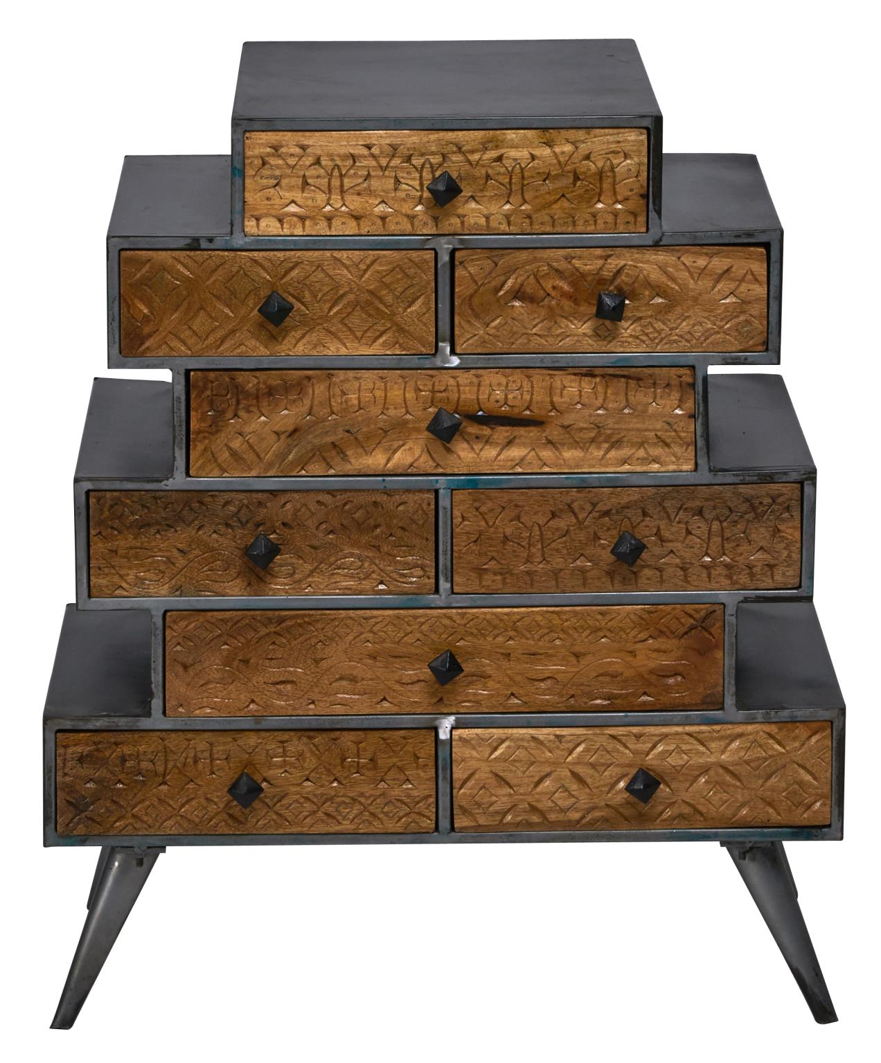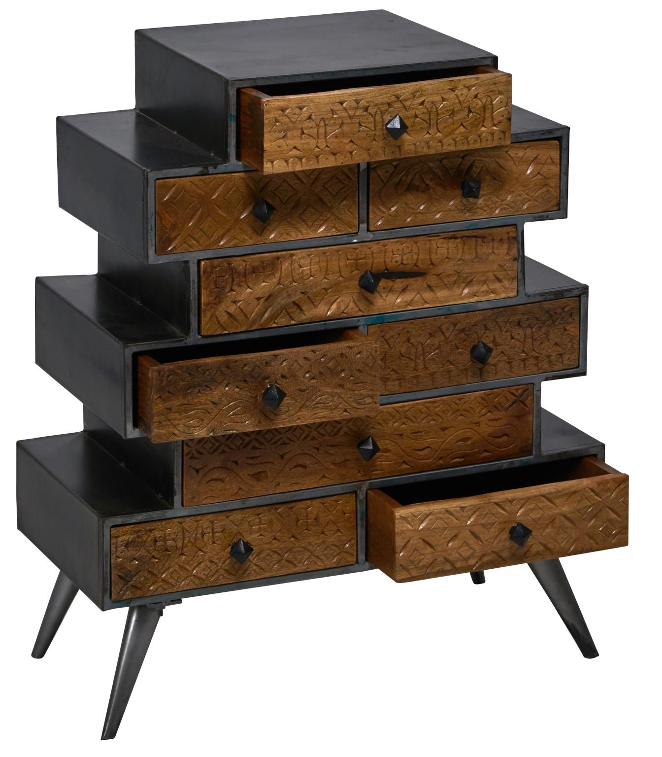This dynamic “storage solution” is constructed of iron in a dark baked lacquer finish. The drawer fronts,, which feature hand carved and routed detail in varying designs and black powder coated iron pyramid shaped knobs,, are of mango wood in a water resistant lacquer sealed blended finish.