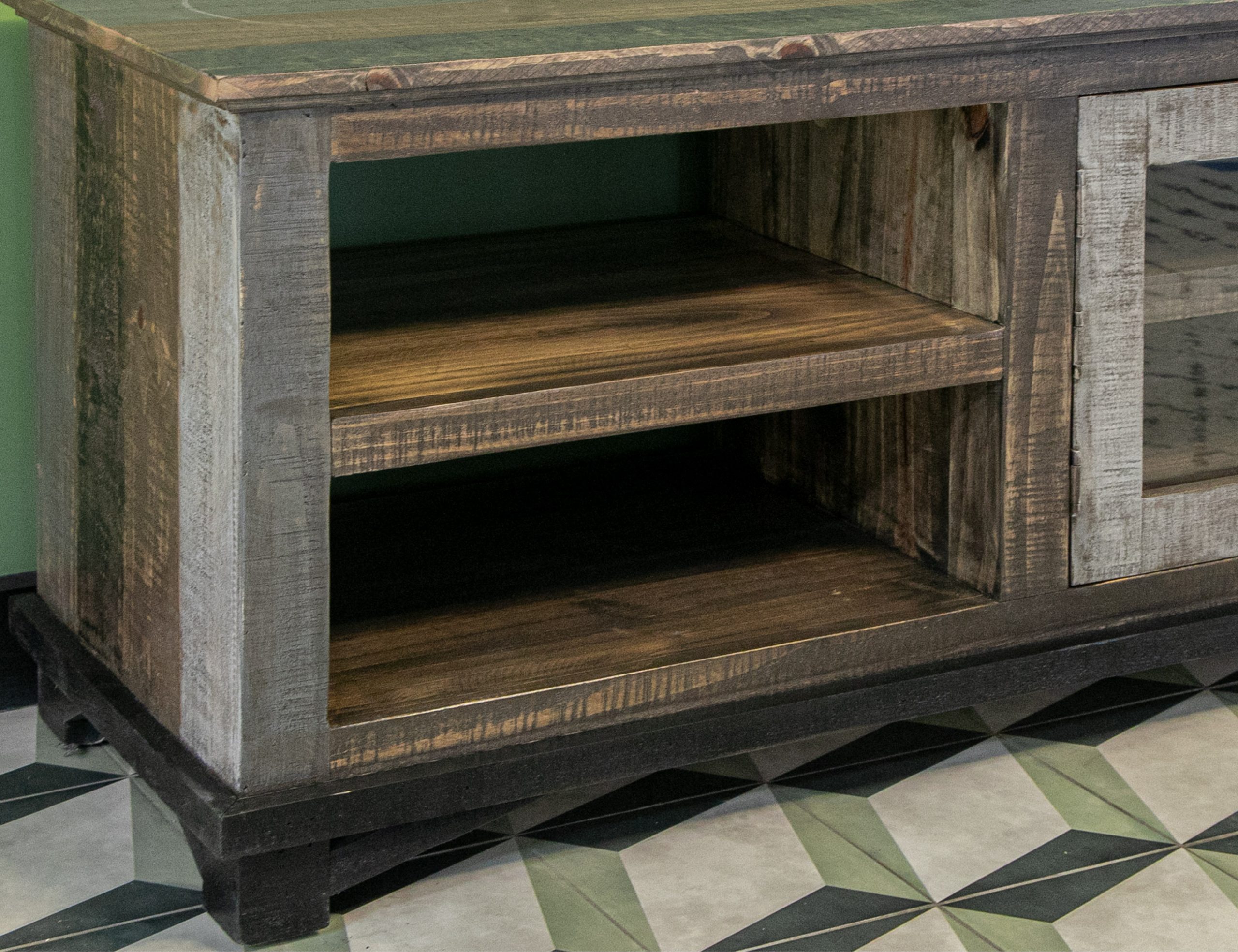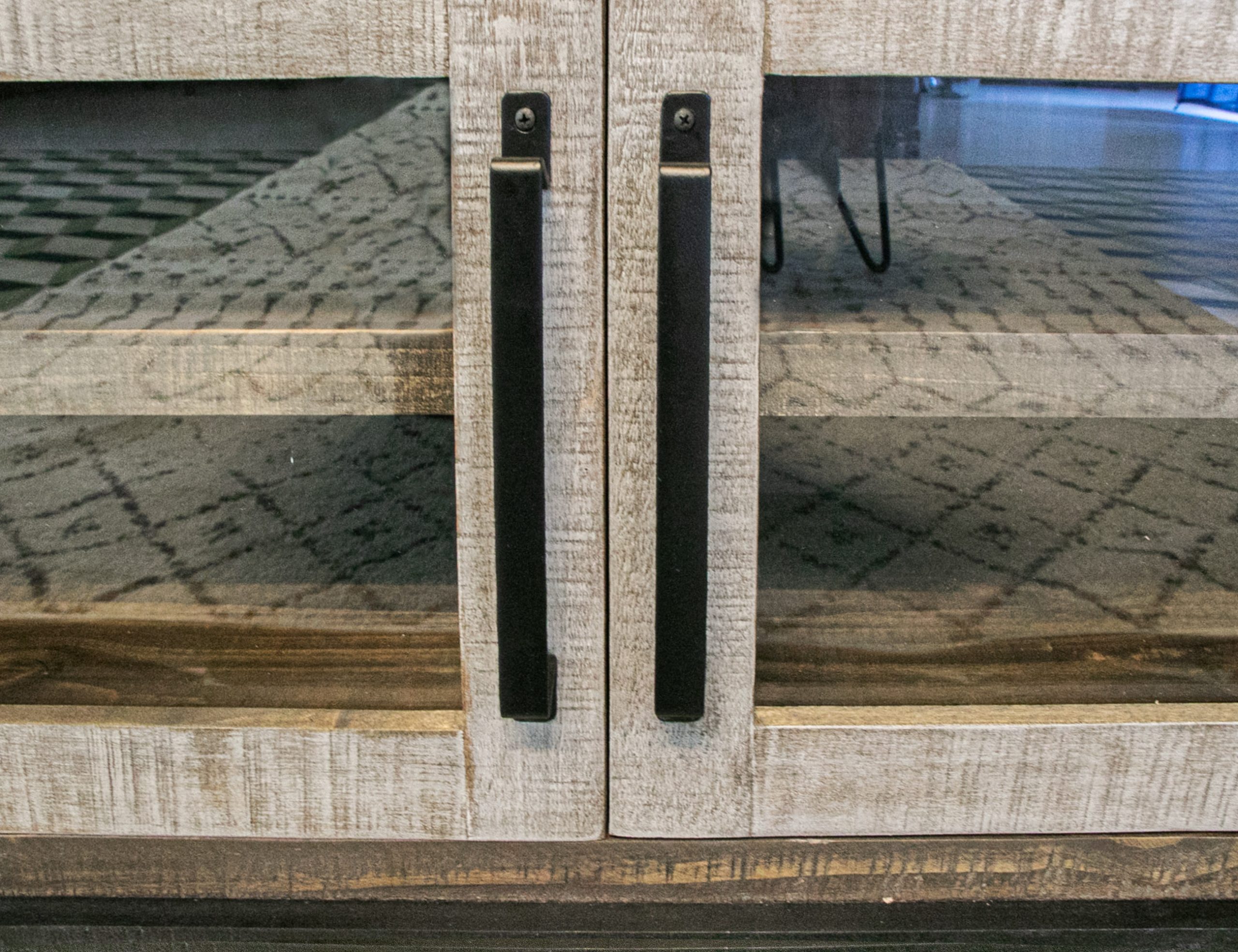 • Multi-step hand-painted water-based acrylic lacquer finish in gray and brown tones for an updated “reclaimed wood” look.