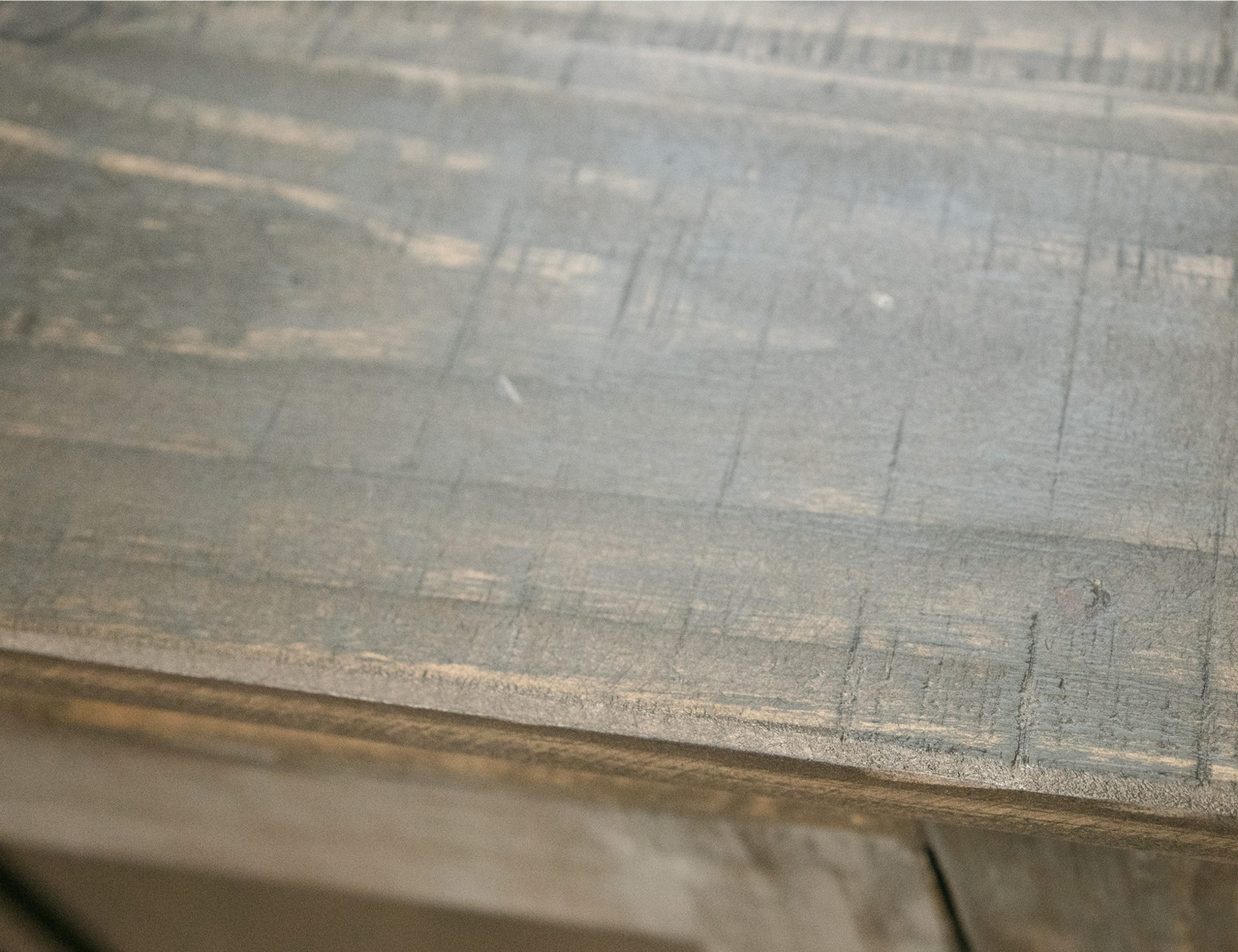 • Multi-step hand-painted water-based acrylic lacquer finish in gray and brown tones for an updated “reclaimed wood” look.