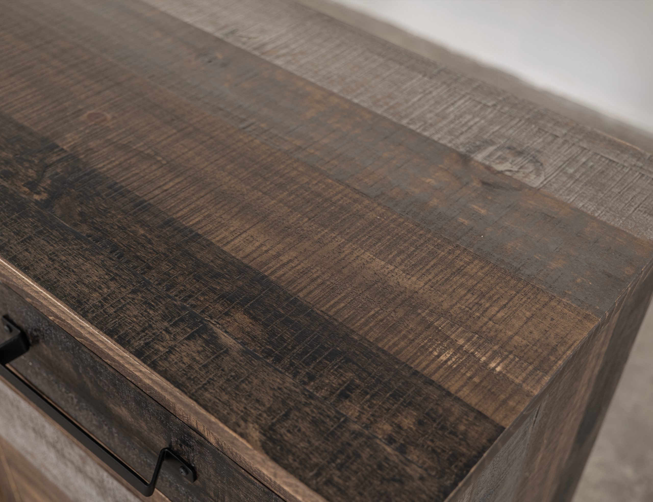 • Multi-step hand-painted water-based acrylic lacquer finish in gray and brown tones for an updated “reclaimed wood” look.