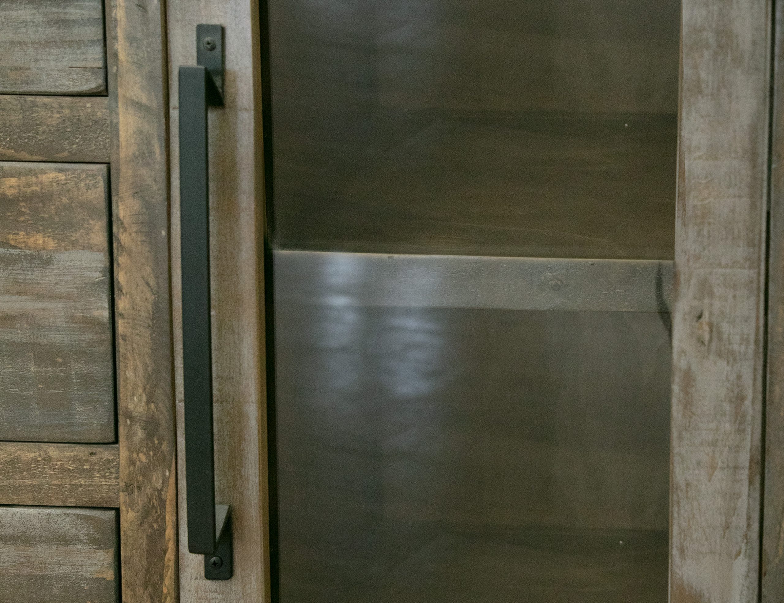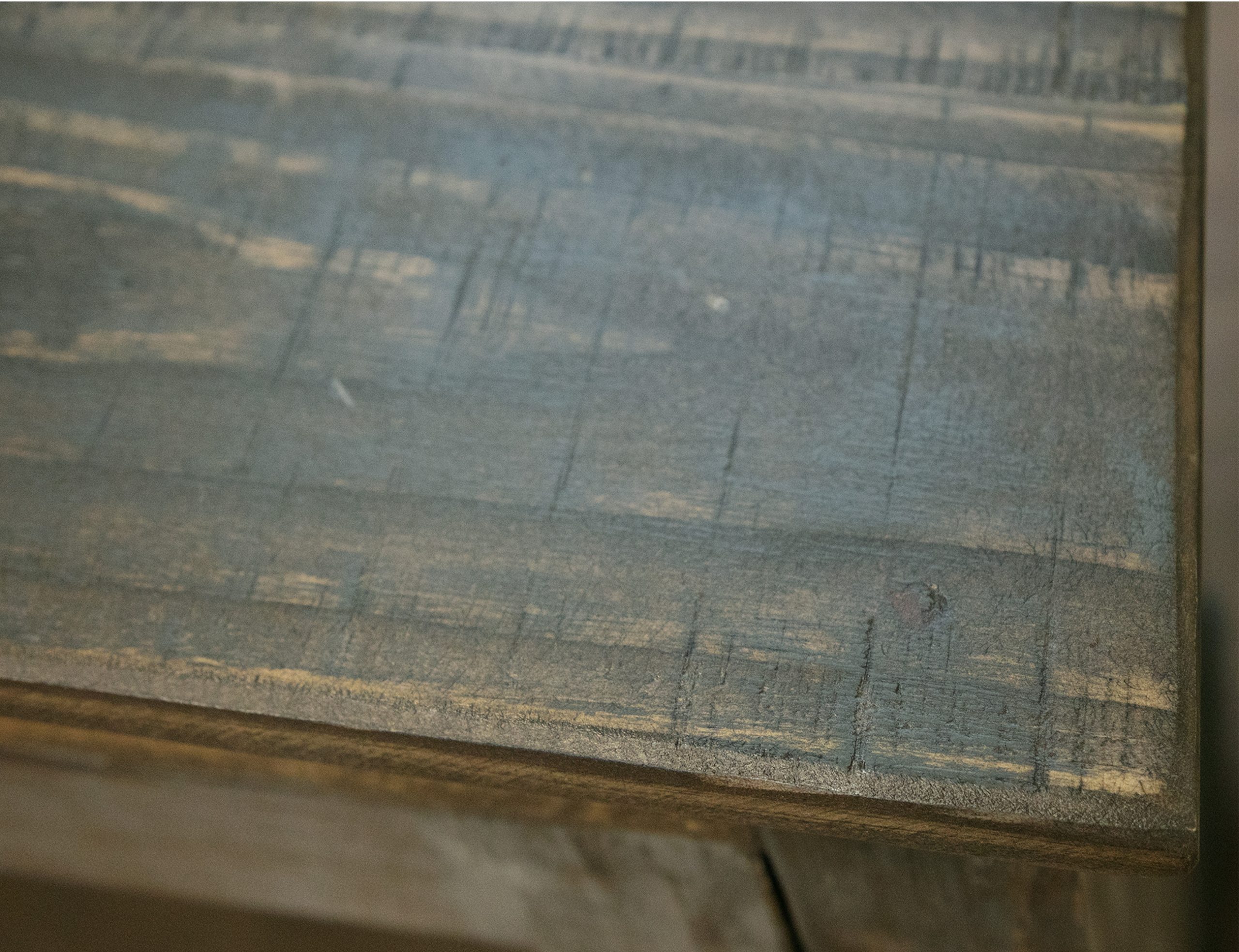 • Multi-step hand-painted water-based acrylic lacquer finish in gray and brown tones for an updated “reclaimed wood” look.
