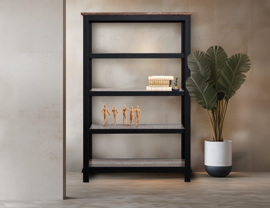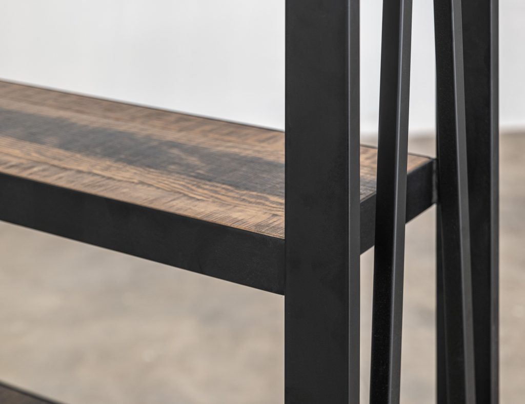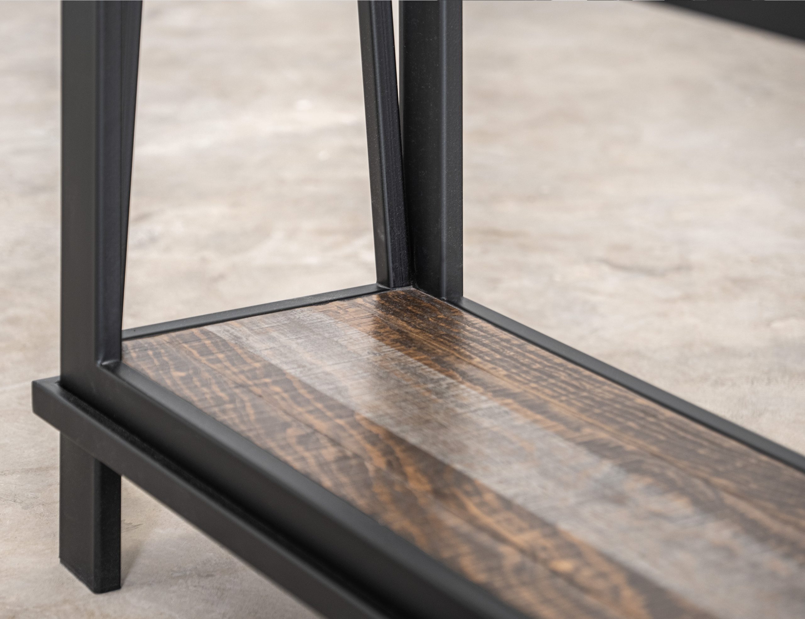 • Multi-step hand-painted water-based acrylic lacquer finish in gray and brown tones for an updated “reclaimed wood” look.