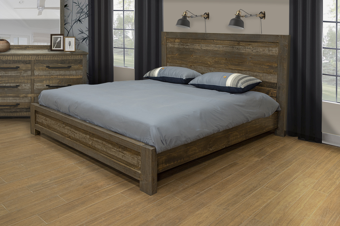 • Multi-step hand-painted water-based acrylic lacquer finish in gray and brown tones for an updated “reclaimed wood” look.