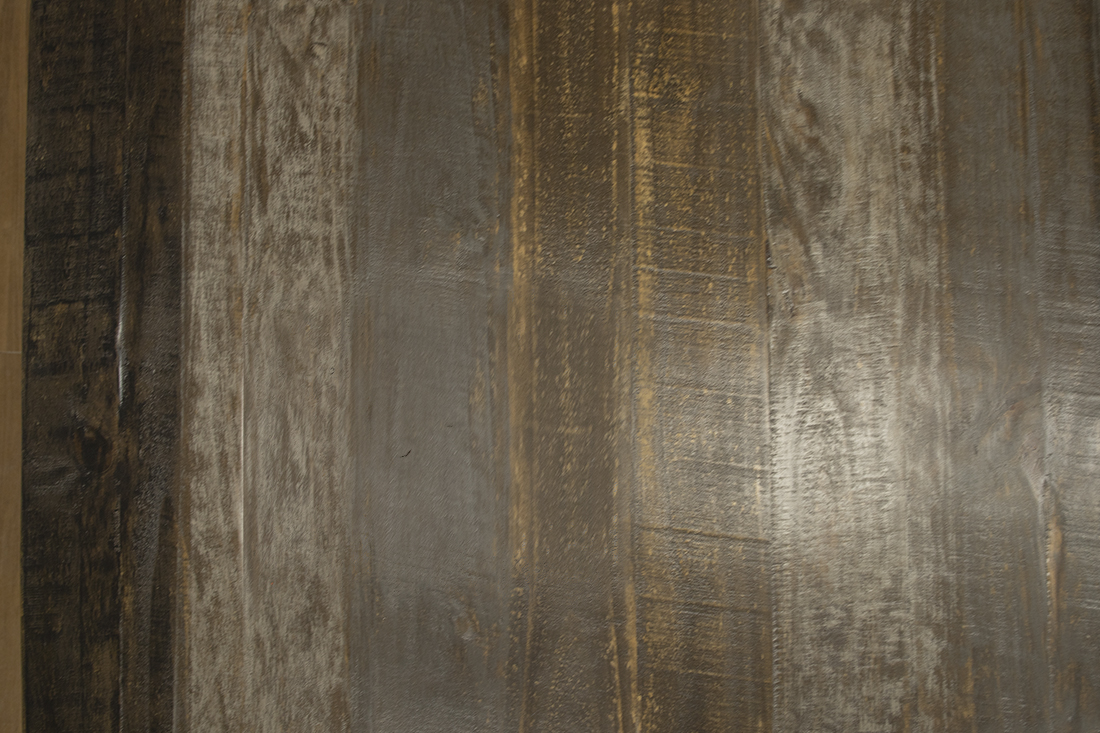 • Multi-step hand-painted water-based acrylic lacquer finish in gray and brown tones for an updated “reclaimed wood” look.