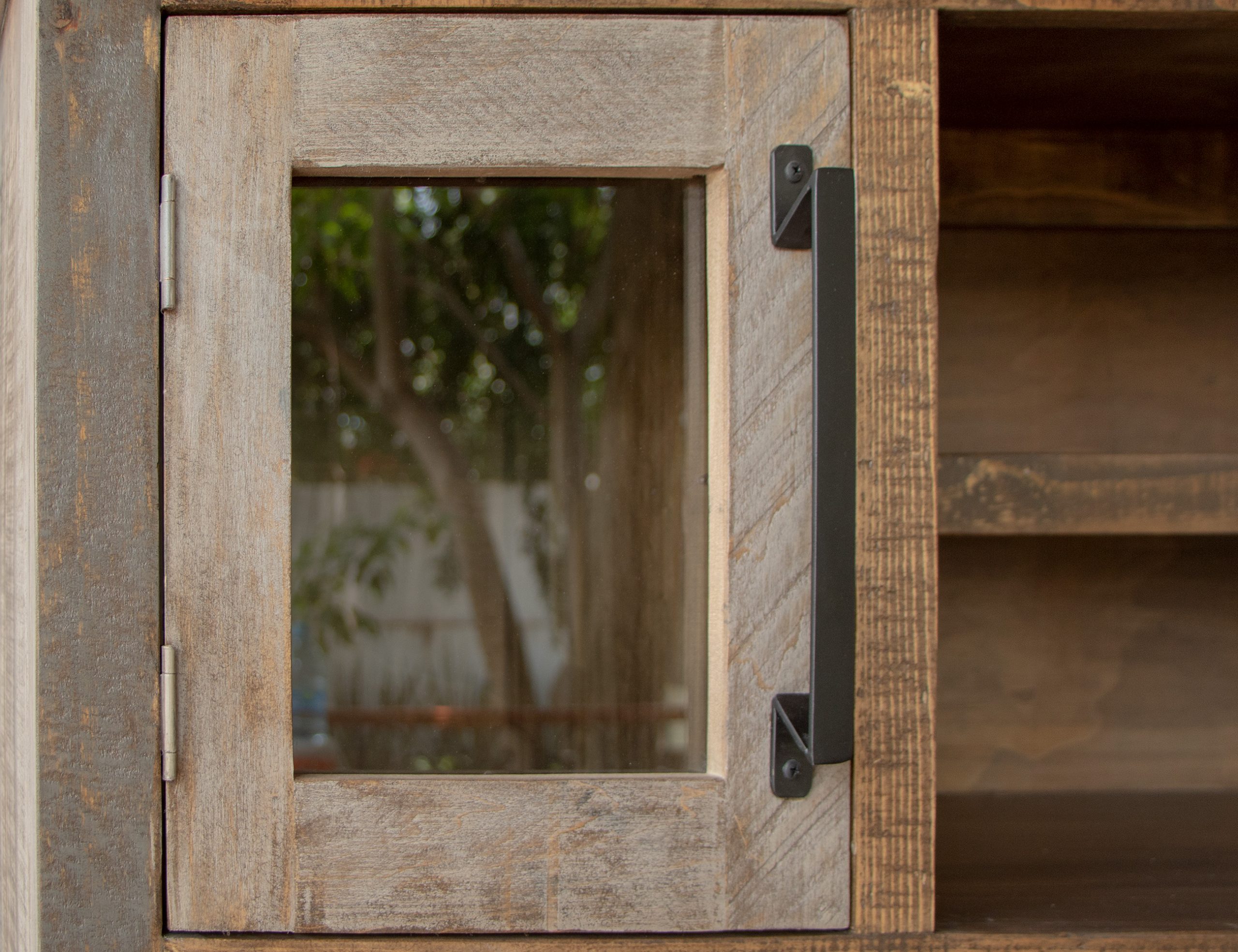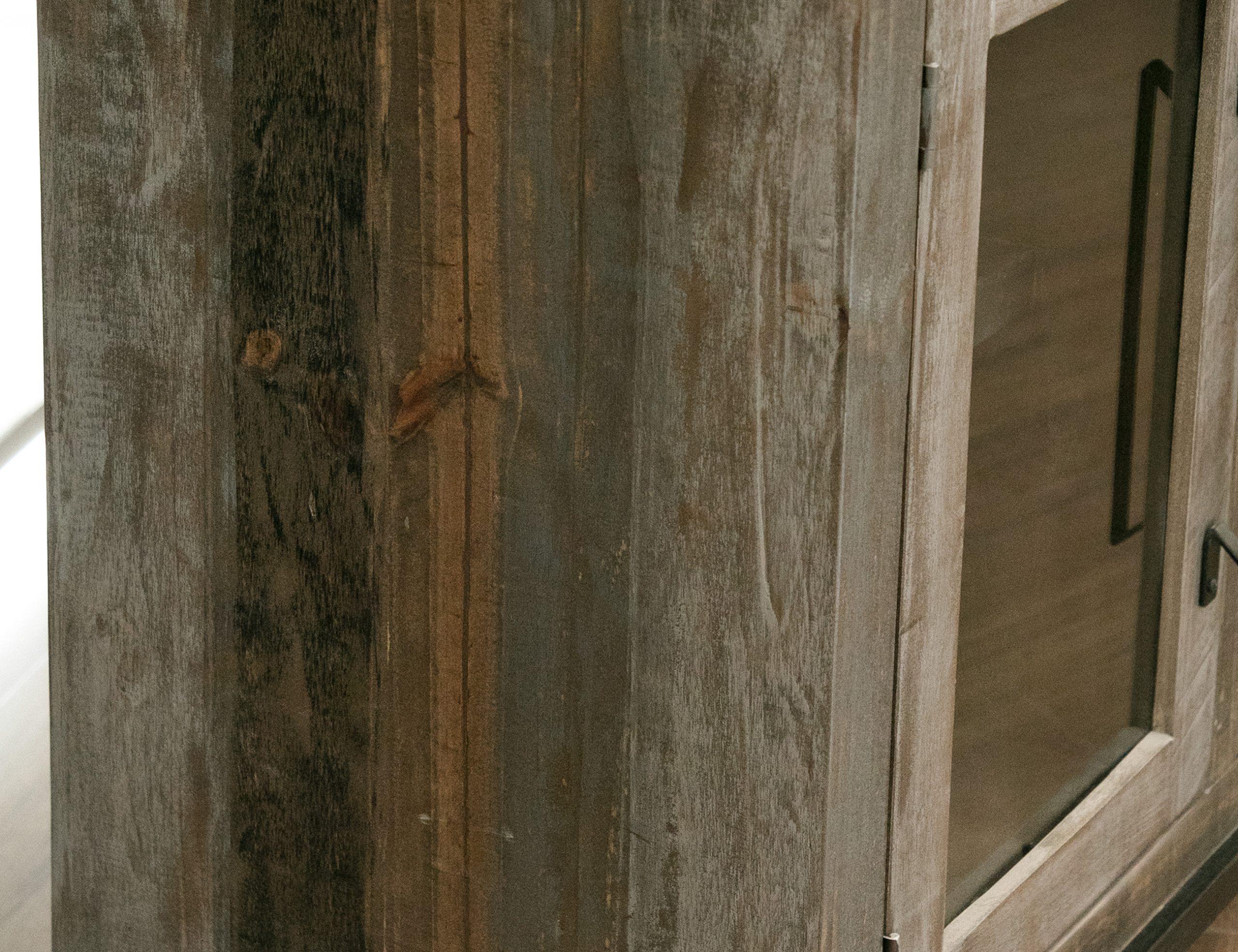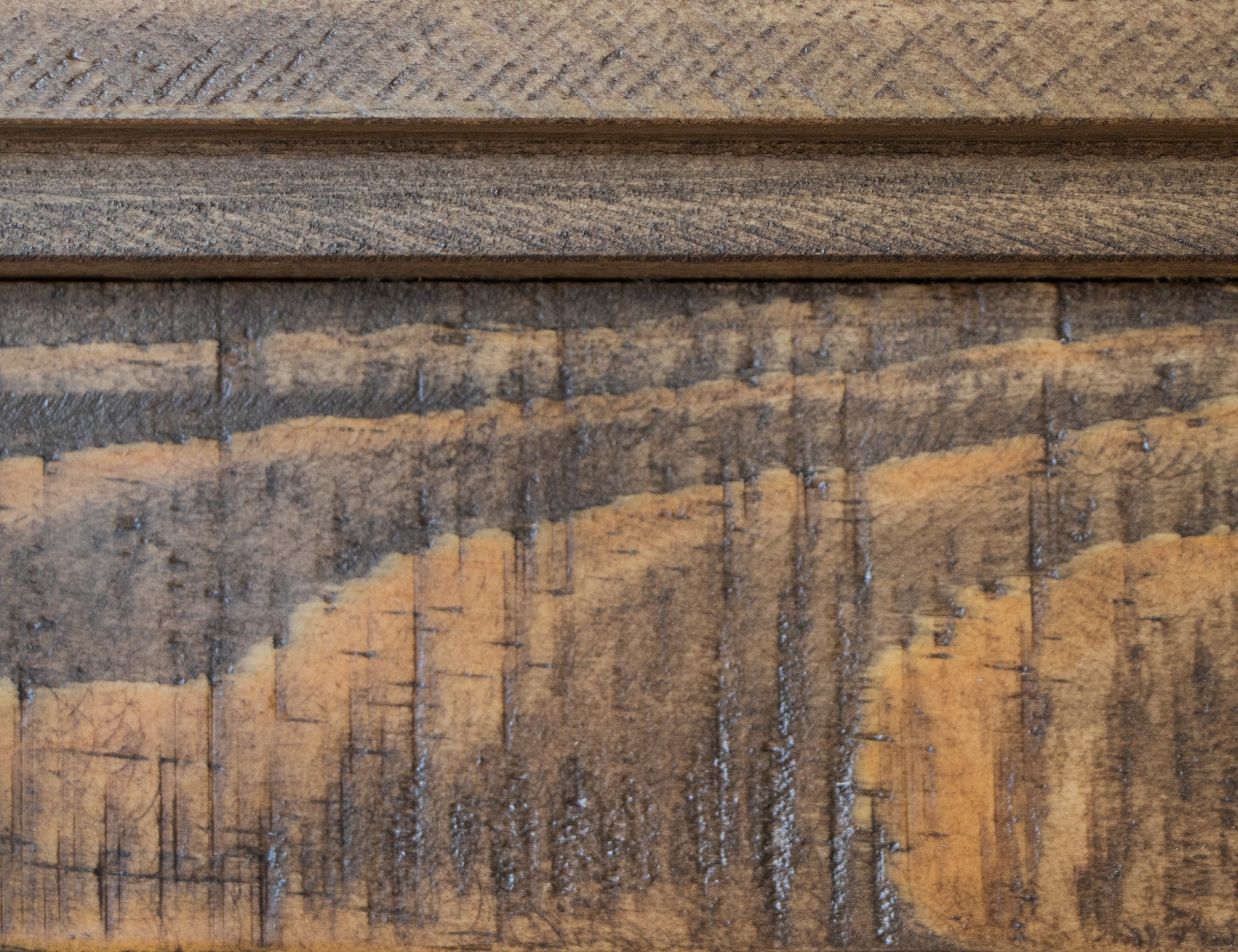 • Multi-step hand-painted water-based acrylic lacquer finish in gray and brown tones for an updated “reclaimed wood” look.