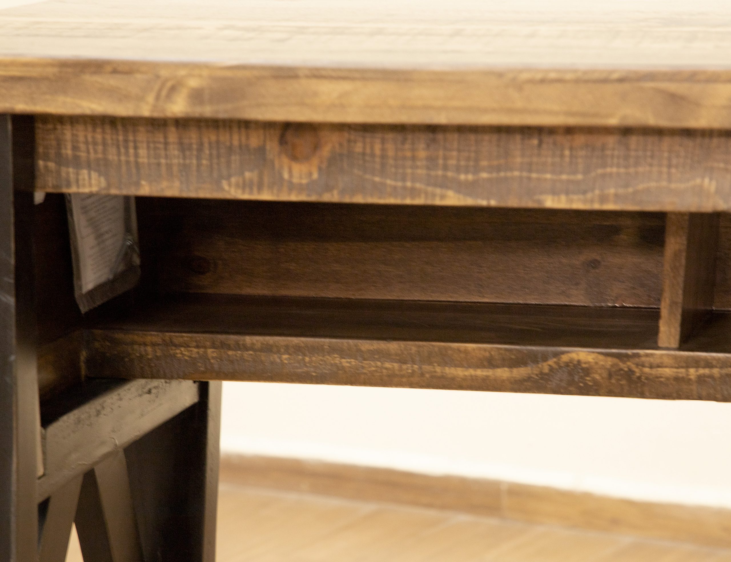 • Multi-step hand-painted water-based acrylic lacquer finish in gray and brown tones for an updated “reclaimed wood” look.