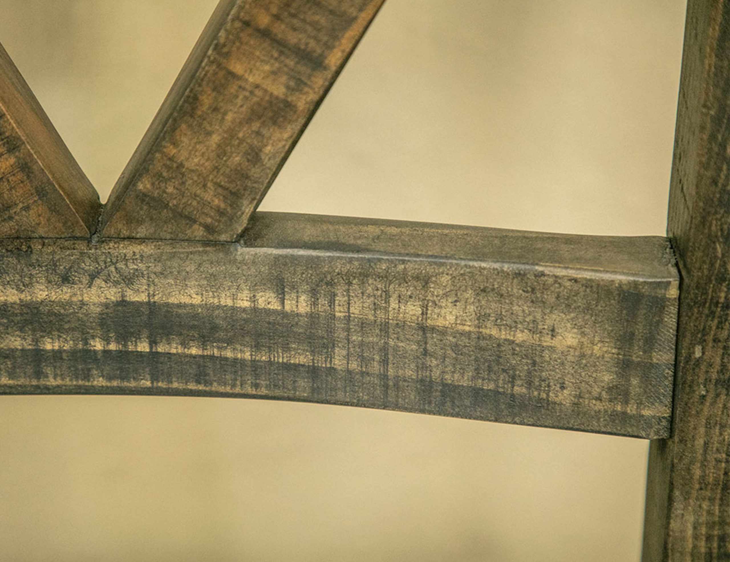 • Multi-step, hand-painted finish in gray and brown tones for a “reclaimed wood” look.