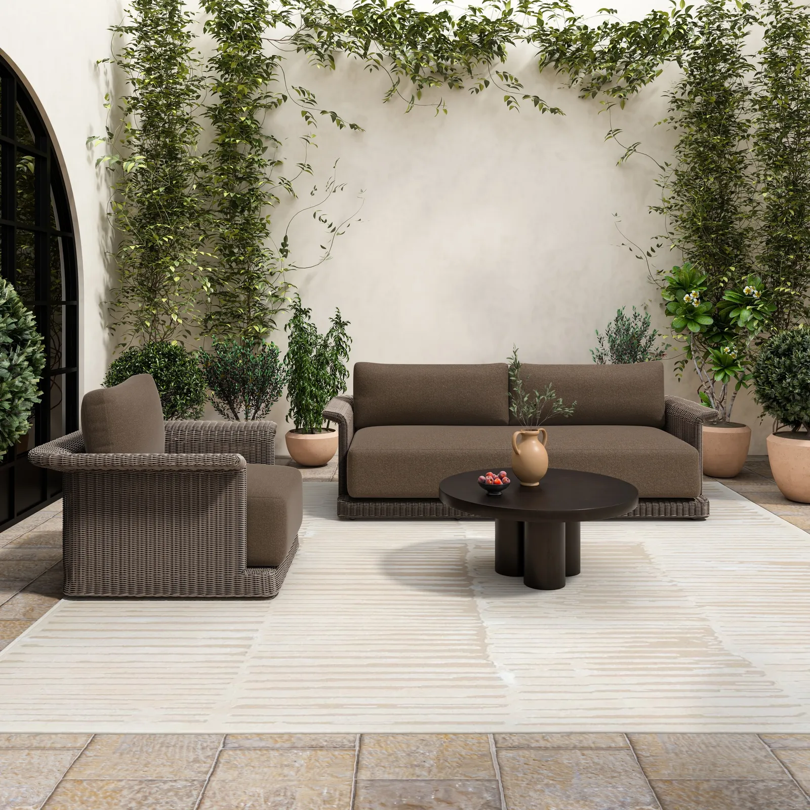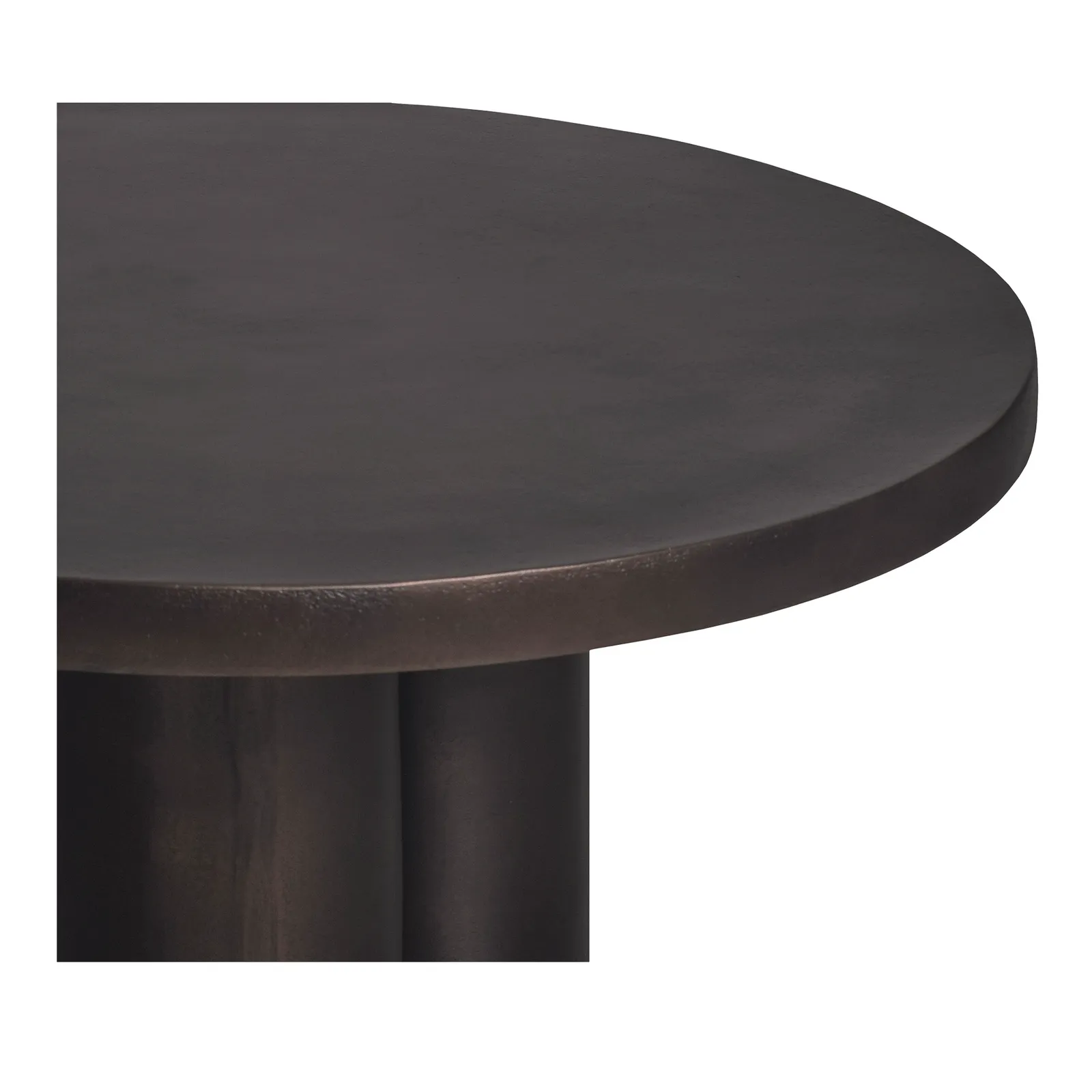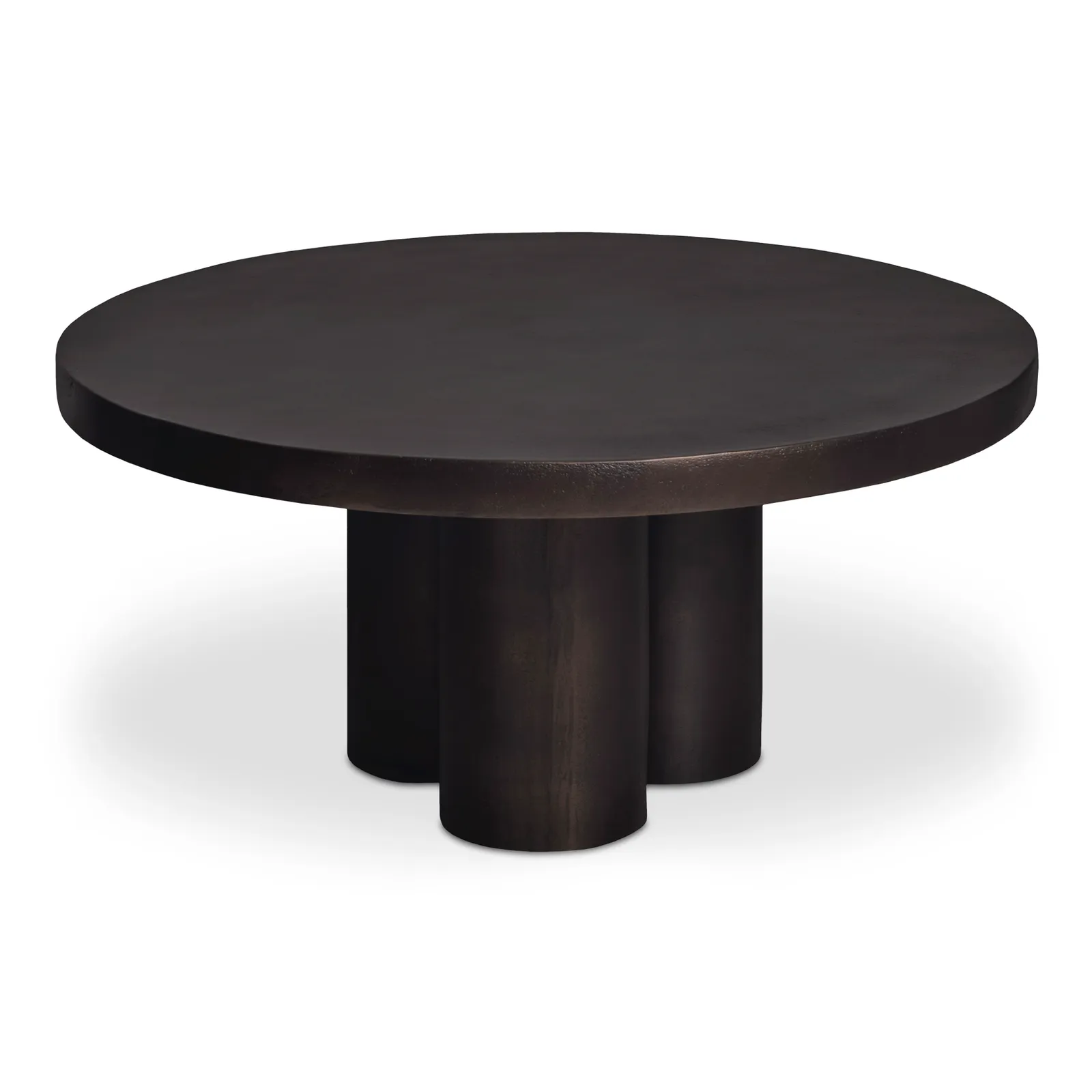 Crafted from outdoor-safe cast aluminum with a sophisticated blackened bronze finish, the Logan outdoor coffee table’s round top and three cylindrical legs create a striking silhouette. The interplay of light and shadow across the textured surface adds depth and character as this minimalist piece effortlessly anchors exterior settings as a serene focal point.