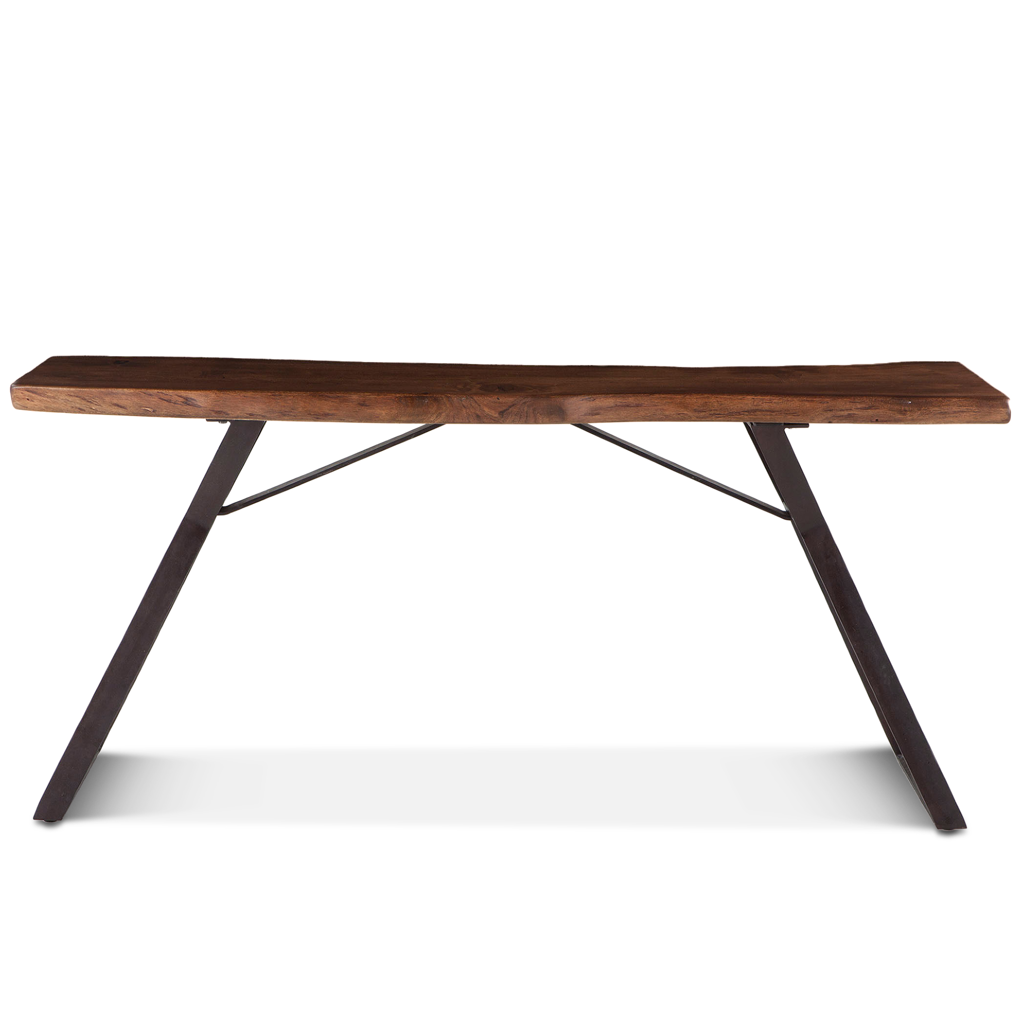 With a classic charm and air of sophistication, the London Loft 68″ Console Table features a thick Acacia wood top in a rich walnut finish with live edge detailing that highlights the organic character of the wood. Its tapered, inward-slanting iron legs are hand-forged for a clean, sculptural look that adds visual intrigue. This piece seamlessly blends natural textures with industrial refinement‚Äîideal for curated interiors, entryways, or behind sofas in residential or hospitality settings.