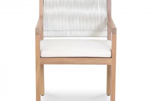 The Luce dining chair is where form and function meet under the sun. Its striking white synthetic wicker weave sits atop a warm teak frame that develops a rich patina over time. Complete with a removable ivory cushion for effortless cleaning; this piece captures a chic light and dark interplay. Inspired by the Italian word for ‘light,’ Luce brings luminous style to al fresco dining, merging the purity of white fabric with the natural warmth of wood.
