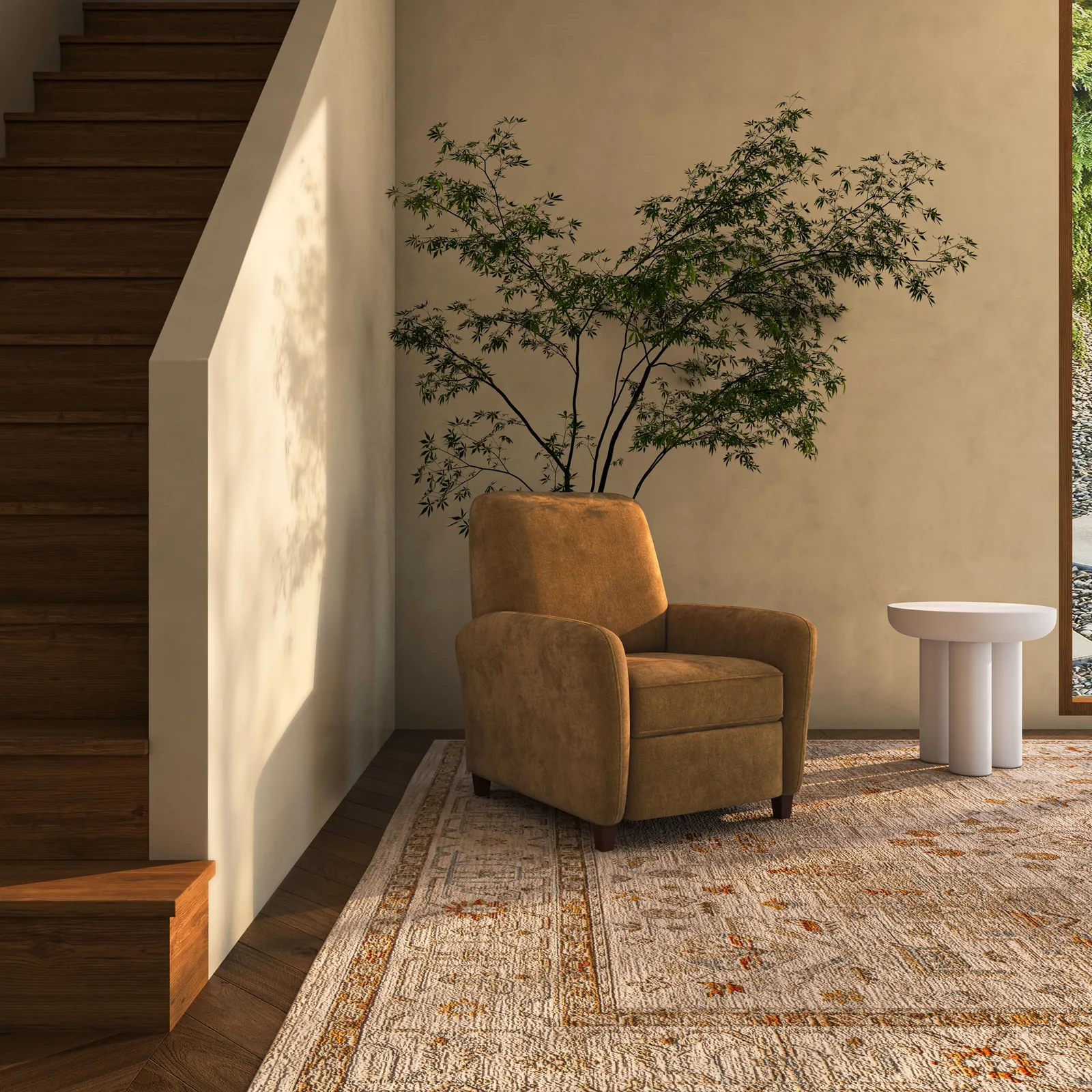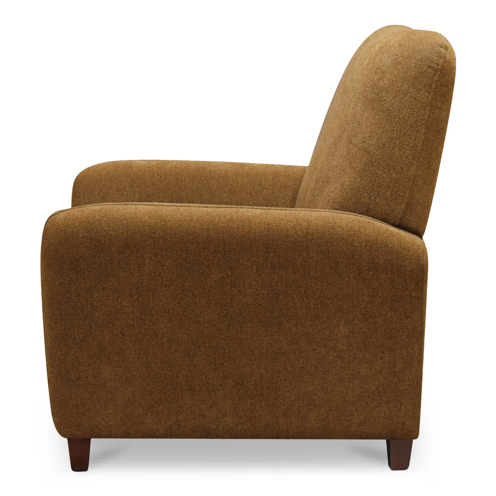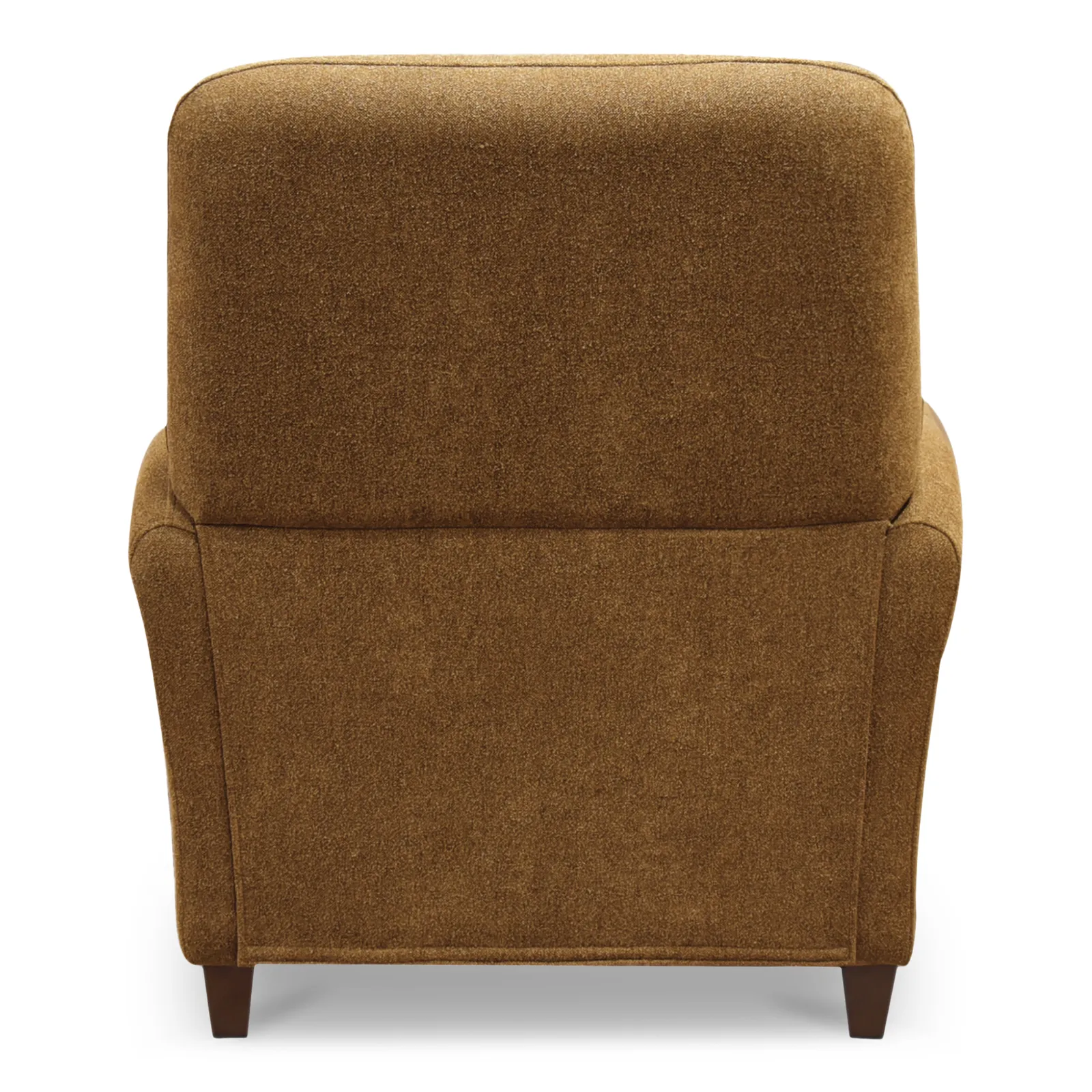 Upholstered in soft fabric, the Luna recliner features a manual push-back mechanism for full reclining over tapered wooden legs. Its transitional style includes gently curved arms, contemporary rounded edges, and sophisticated piping details running along the edge of the arm and seat.