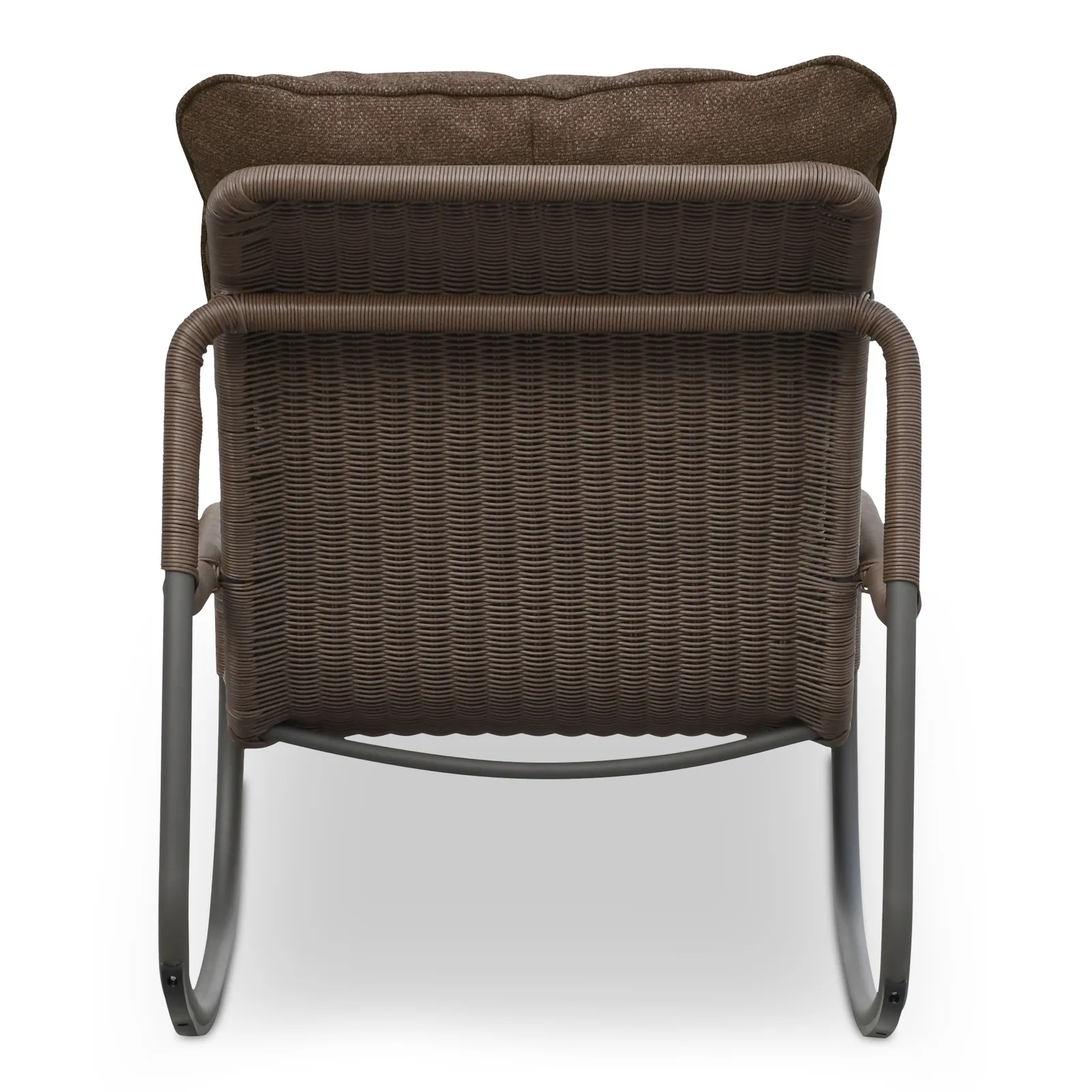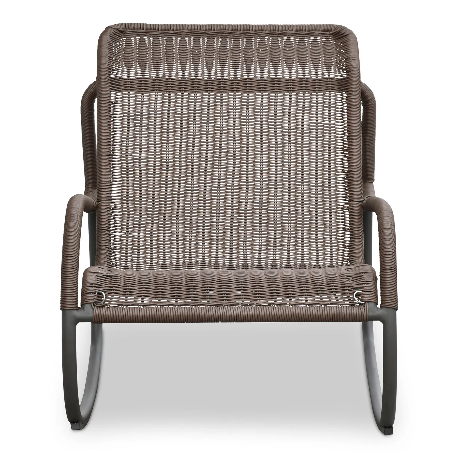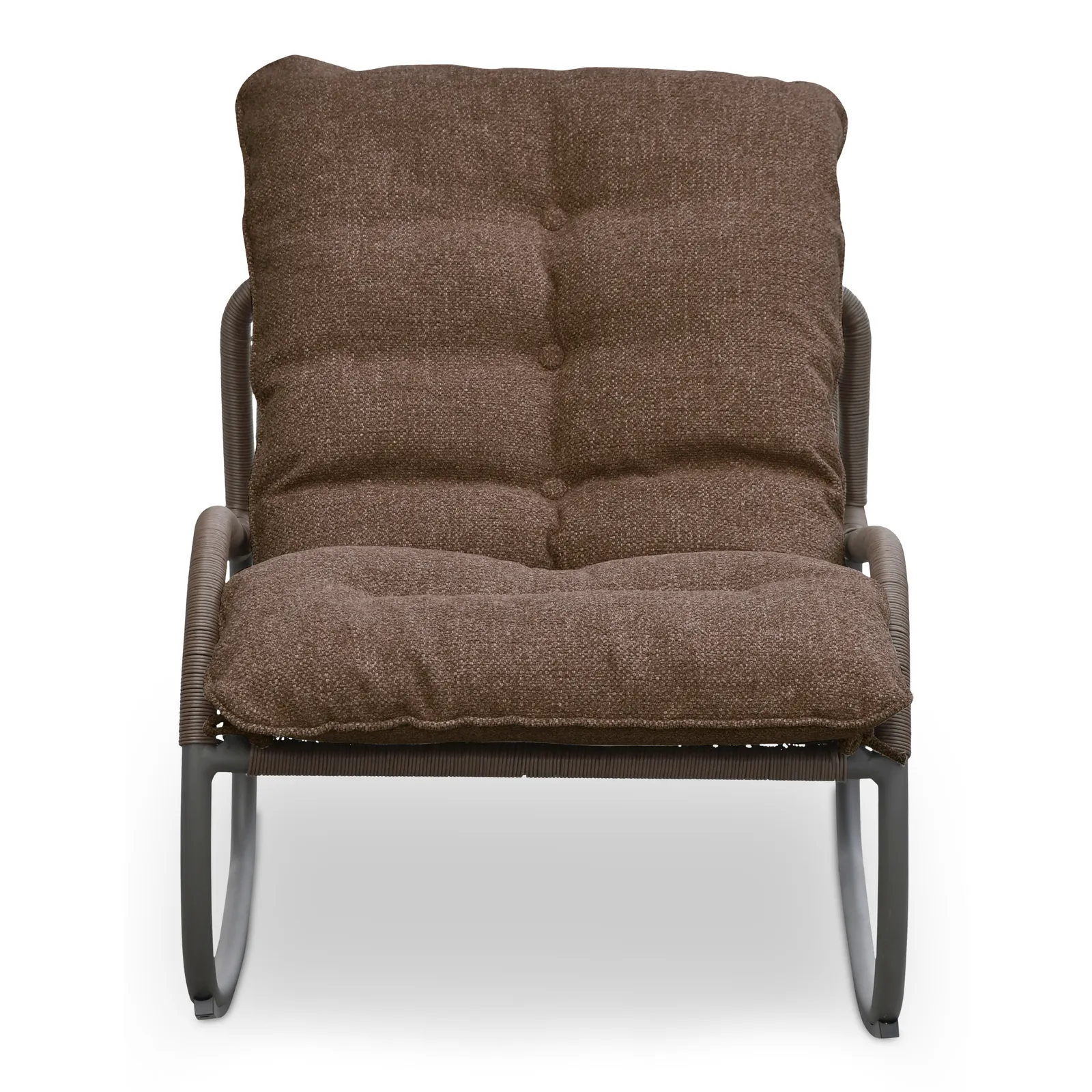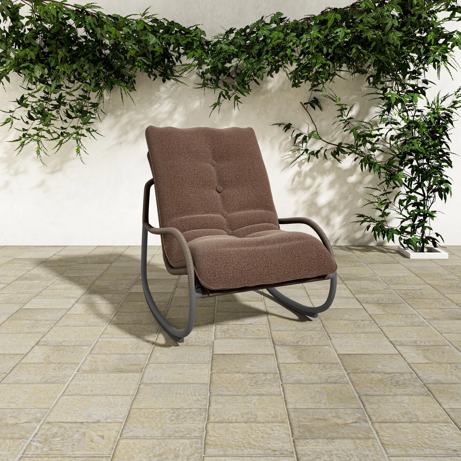 The Lyra rocking chair’s sleek aluminum frame harmoniously blends with synthetic wicker, creating an understated luxe feel. The plush cushion molds to your body, inviting relaxation. Remove the cushion to reveal intricate woven seating, offering a minimalist alternative.
