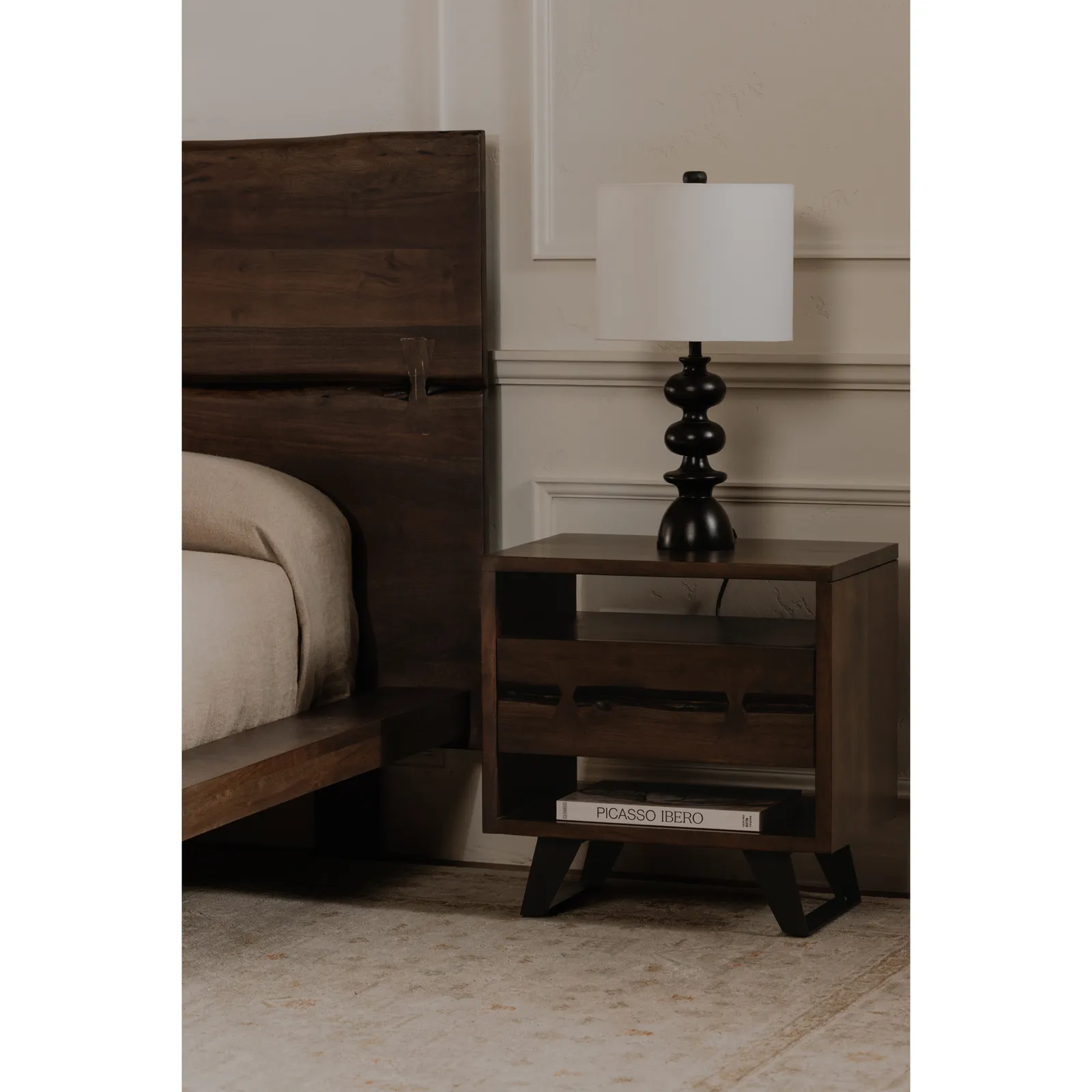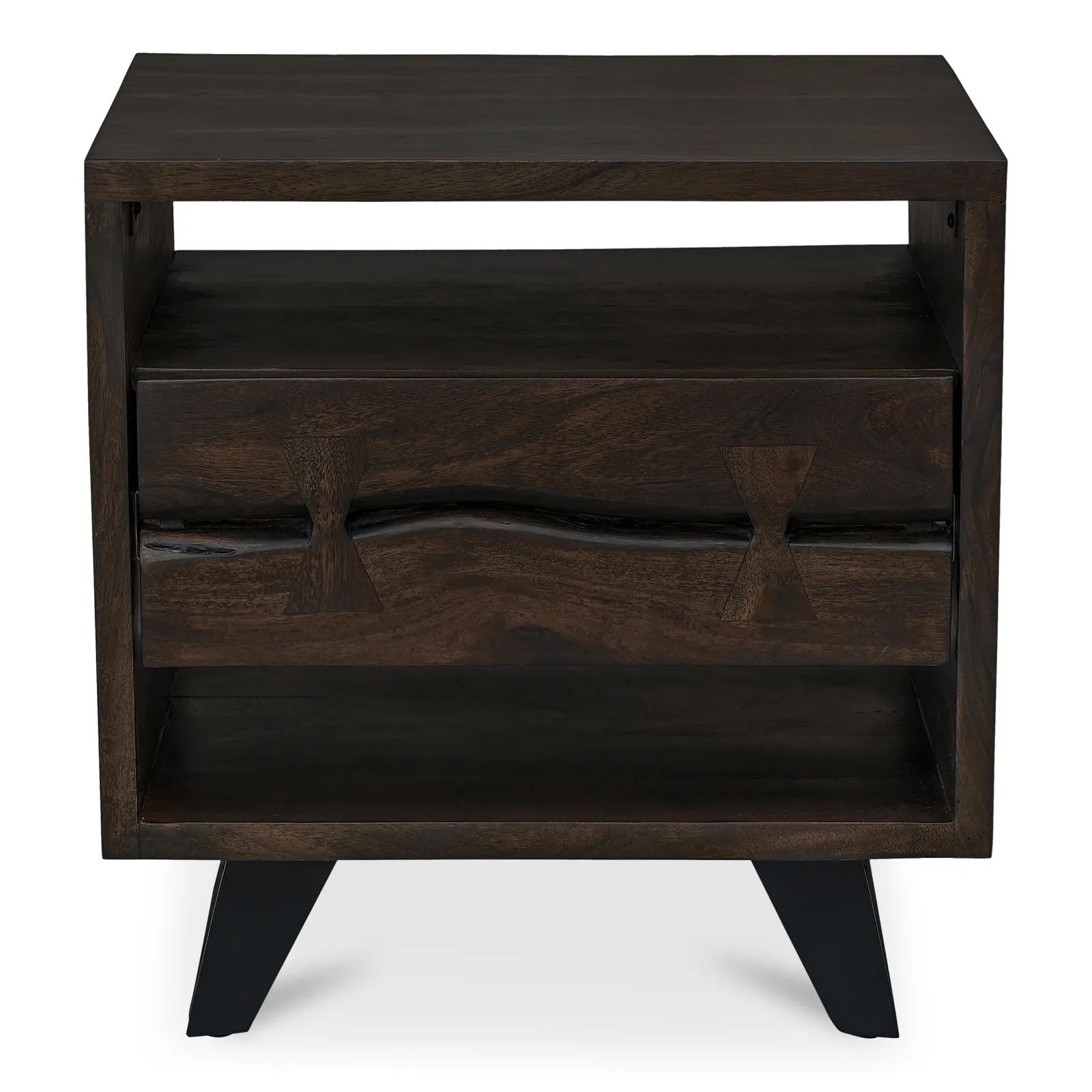 - 1 spacious drawer with two live-edge detailing with butterfly joinery technique drawer front