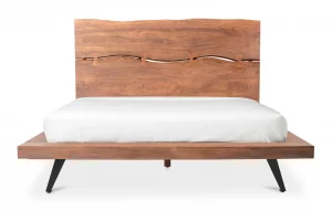 The Madagascar platform bed is a sublime fusion of nature’s tranquility and modern sophistication. Crafted from solid Acacia wood, this bed showcases a low platform design accentuated by an organic edge headboard, masterfully joined using the intricate butterfly woodworking technique with the entire bed supported by solid steel legs in a black powder-coated finish, elevating its rustic-industrial allure.