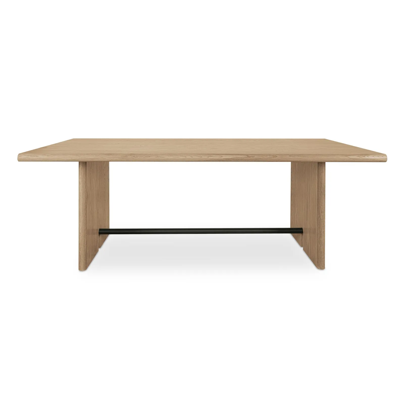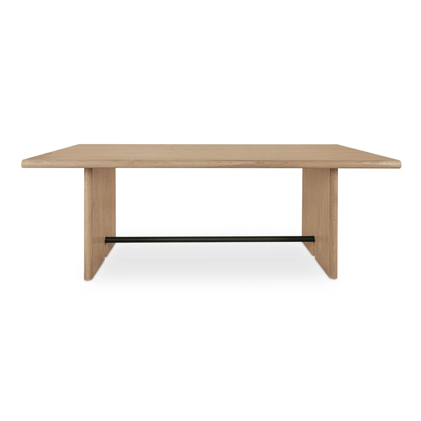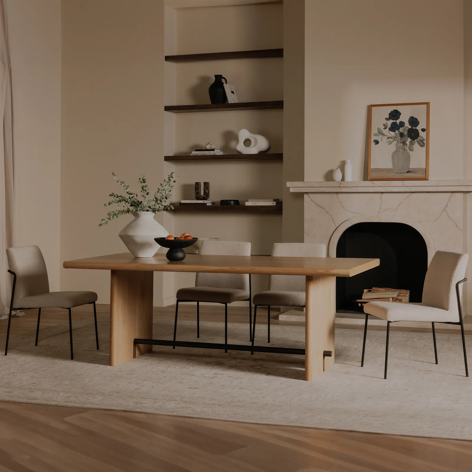 Crafted from solid oak and oak veneer, the Madison dining table’s tabletop features elegant bullnose edges along the length, juxtaposed with crisp edges on the shorter sides. The base mirrors this design, enhanced by graceful arched carvings and a blackened bronze metal bar.
