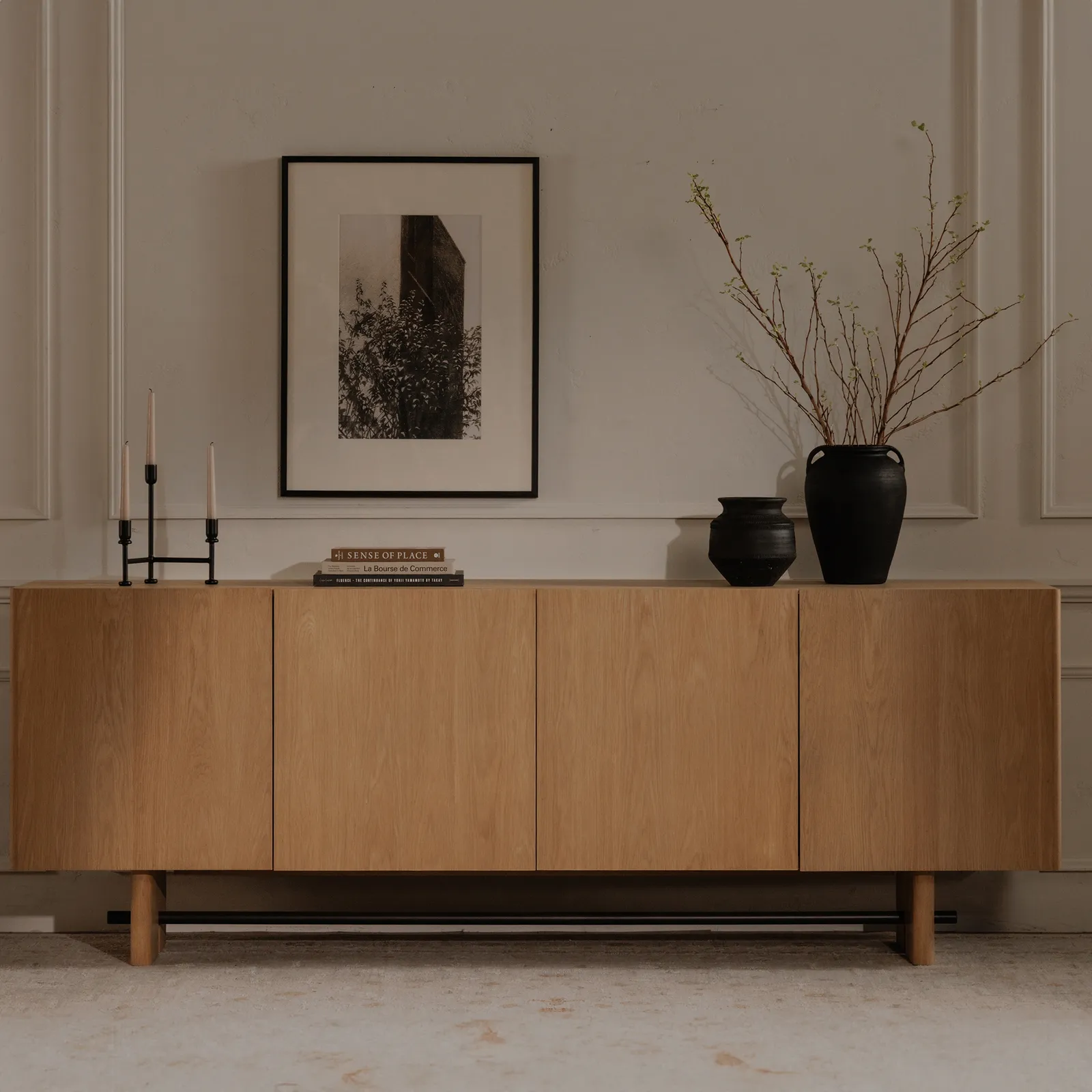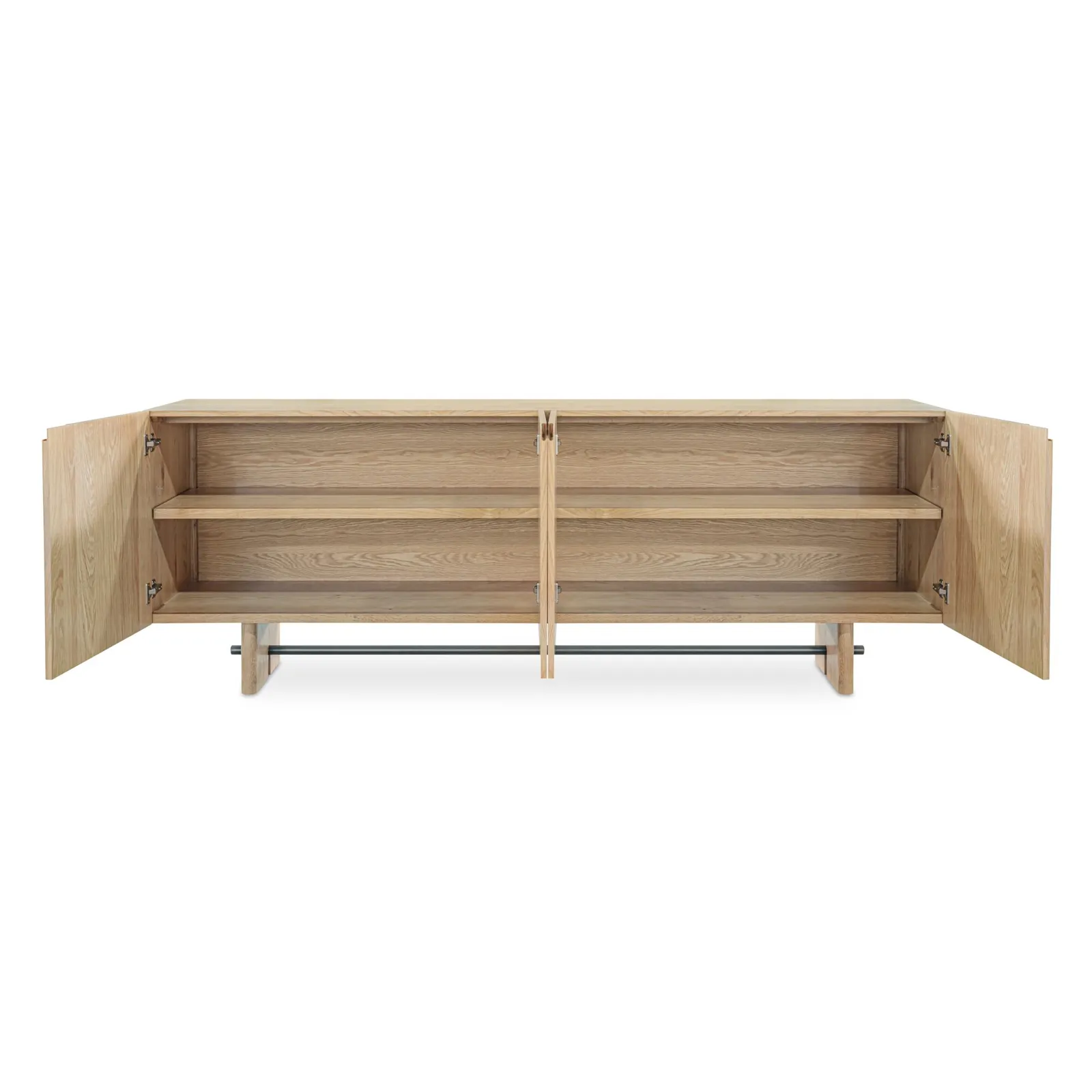 The Madison sideboard’s subtle carved handle along the rounded edge door frame maintains an uninterrupted facade, showcasing oak’s natural grain as it forms the tabletop and base edge. Arched leg carvings frame a blackened bronze metal bar.