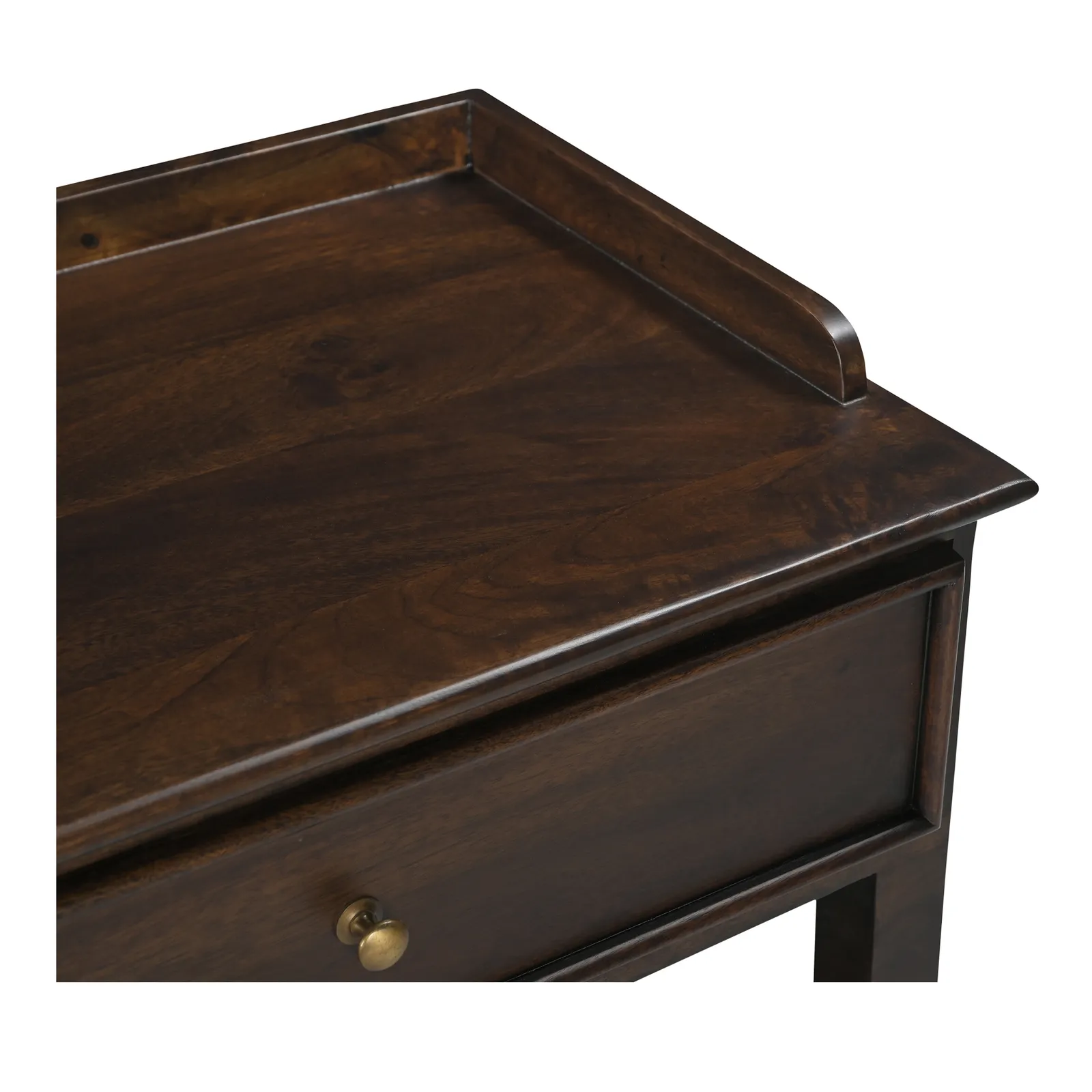 - Constructed from Mango wood with brass-finished iron hardware