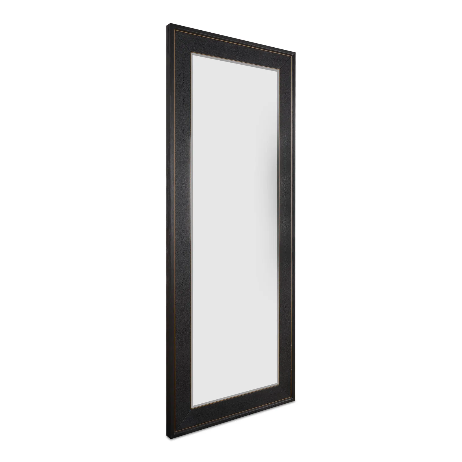 With each item upholstered in the highest quality vegan leather shagreen, the Mako collection brings effortless style, visual texture and substance to your living space. A reflection of good things to come, this contemporary modern mirror features a black oak frame with gold trim around the edges.