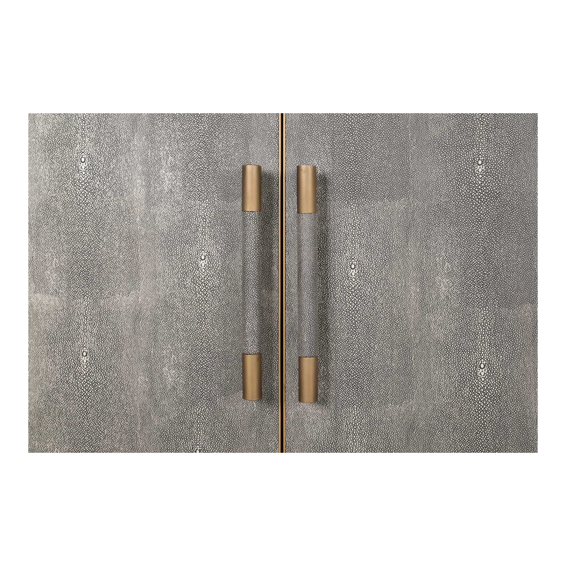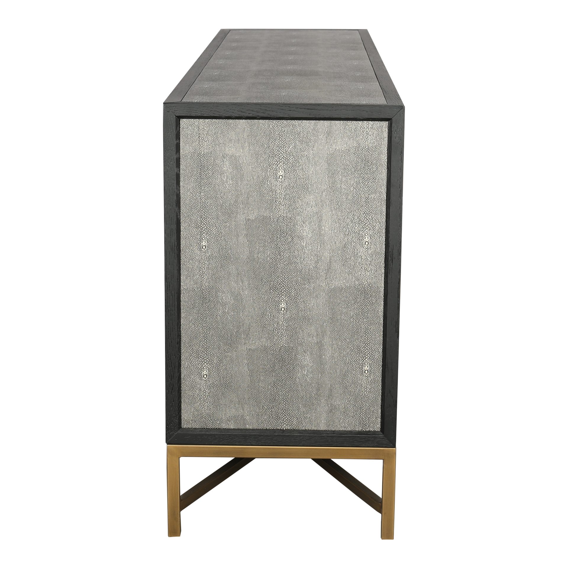 A contemporary homage to the timeless allure of Art Deco, the Mako sideboard infuses understated sophistication with rich visual texture and enduring style. This striking storage solution is artfully crafted with a bold black oak frame, upholstered with luxurious vegan leather and adorned with antique gold-finished accents for a harmonious blend of subtlety and depth.