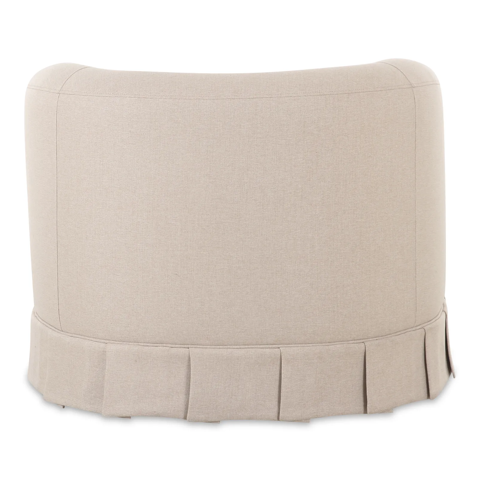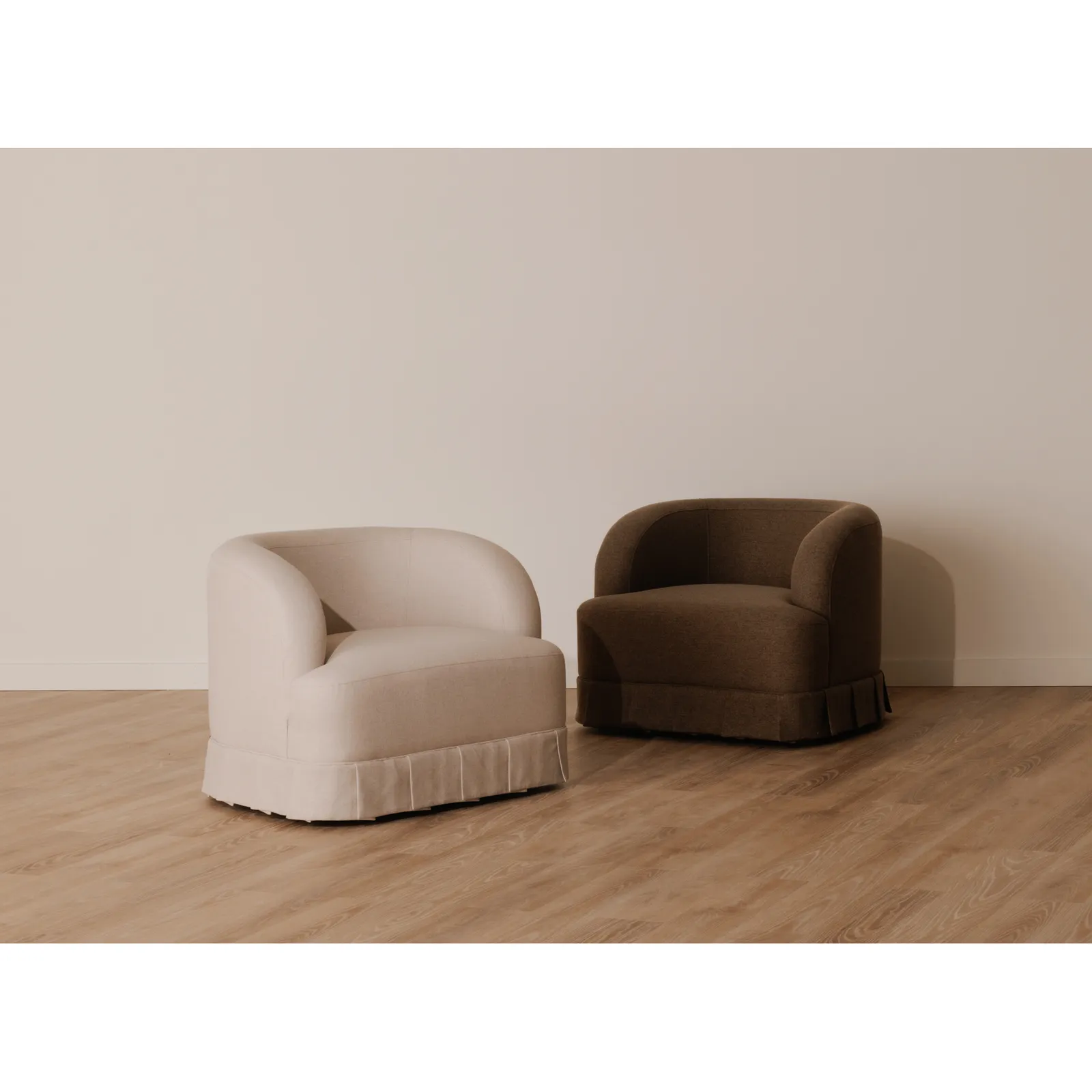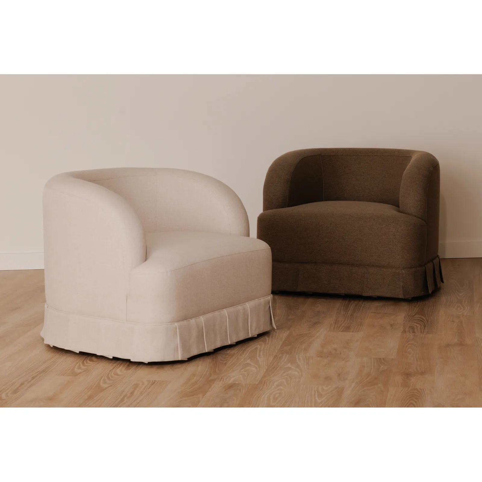 The Maren swivel chair exudes a soft, feminine aesthetic, upholstered in a warm, neutral fabric and featuring a playful yet refined box pleat base reminiscent of vintage finesse, straddling the line between contemporary form and traditional finish. With smoothly rounded corners and graceful, curving forms adding softness to the design, this piece is a study in elegance and subtlety.