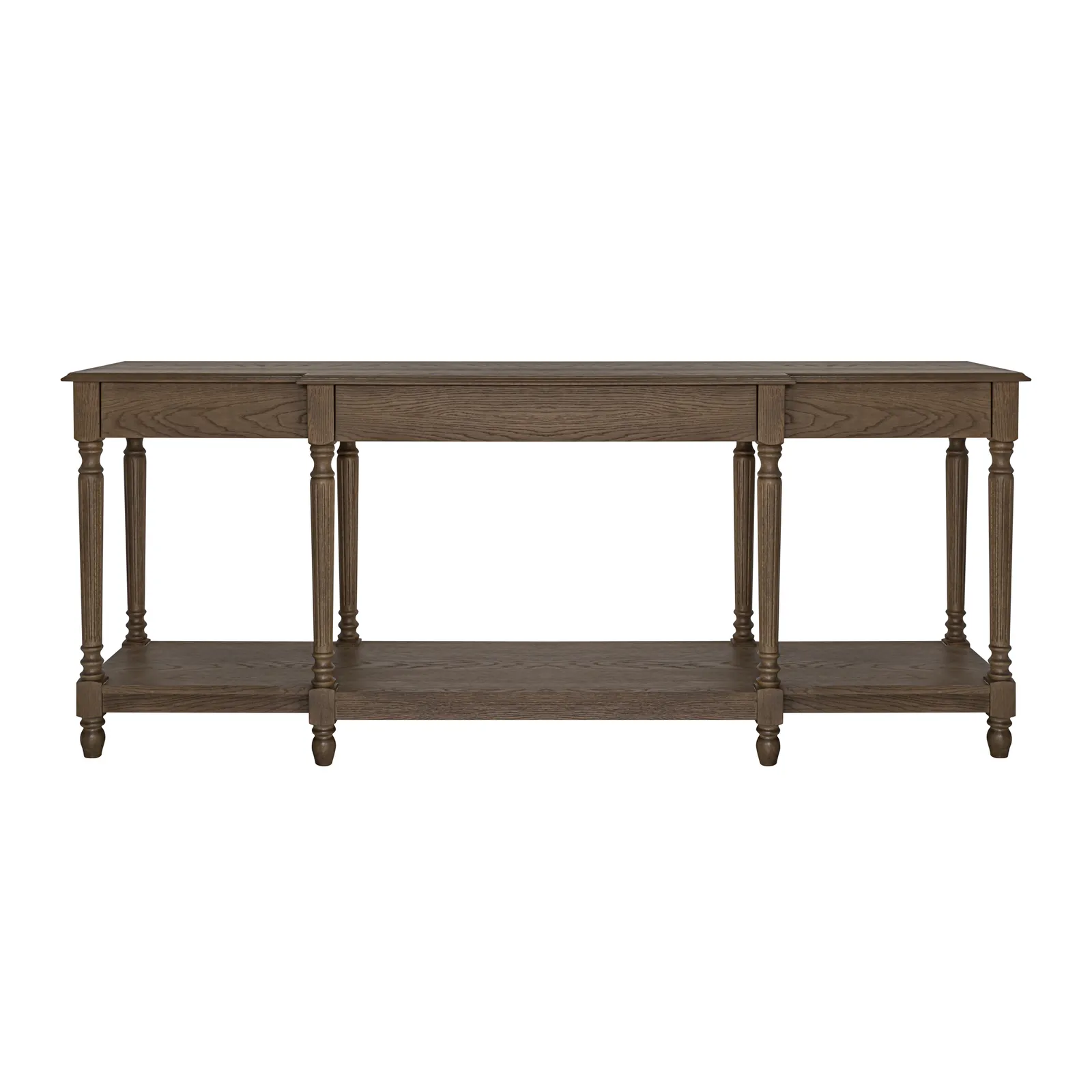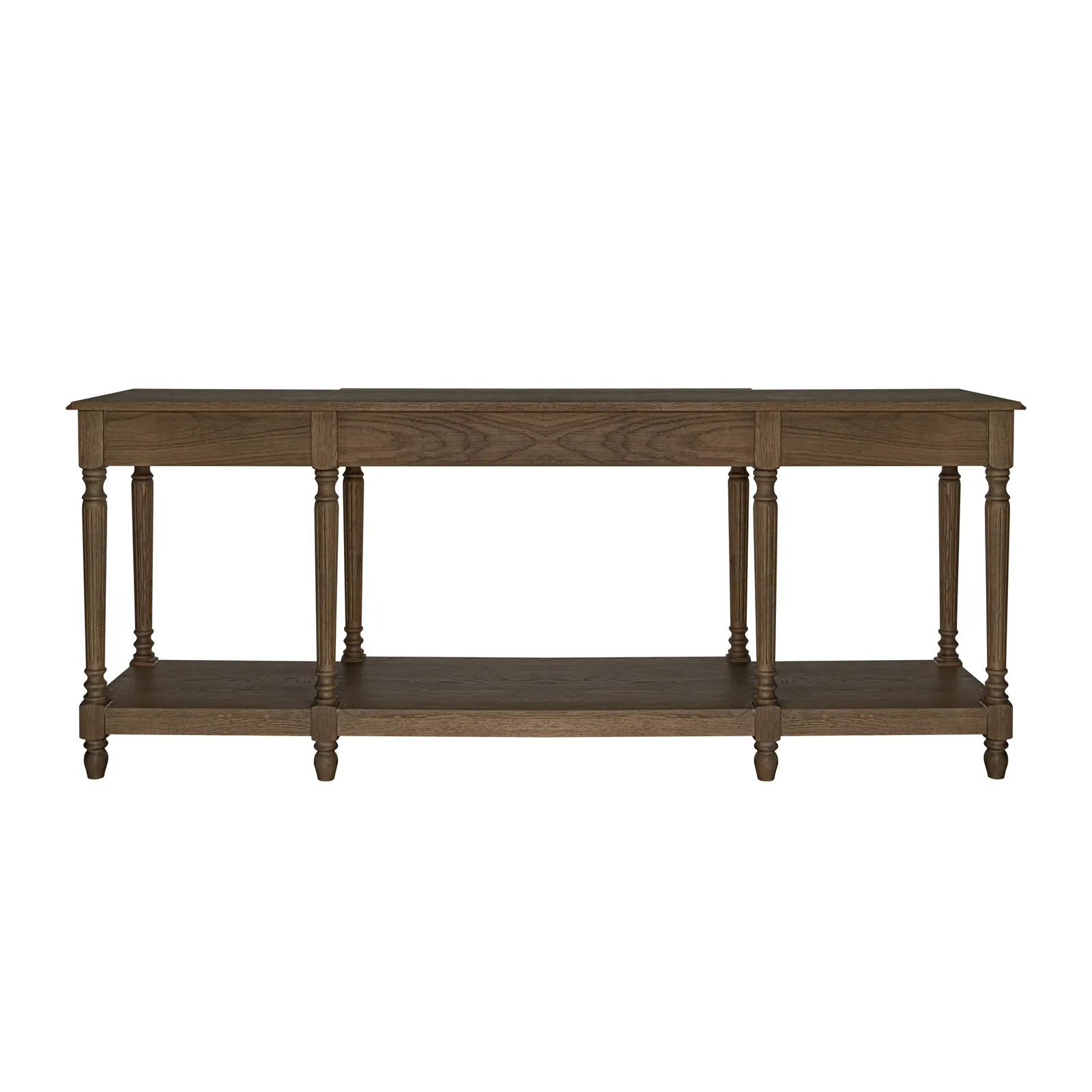 Meticulously crafted from solid oak with a rich brown finish, the Martha console table’s graceful silhouette features an alluring overhang and expertly turned legs. A subtly protruding middle drawer adds dimensional intrigue, while three drawers and an open shelf offer discreet storage.