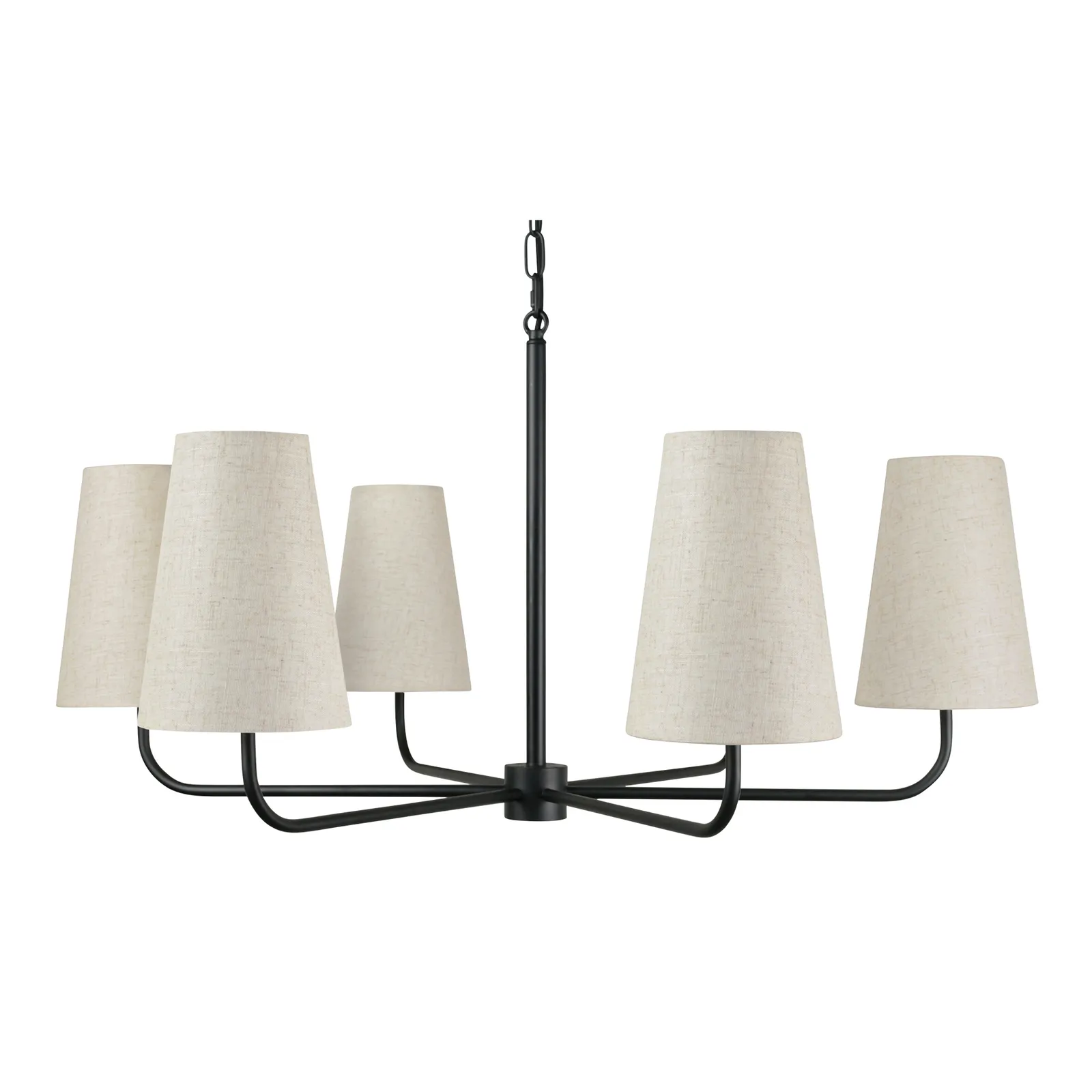 The Mathis chandelier’s sleek metal frame and delicate chain detailing create an illusion of weightlessness, while six tapered linen shades diffuse a warm, inviting glow. This chandelier marries simplicity with sophistication, complementing various interior styles, from contemporary to transitional.