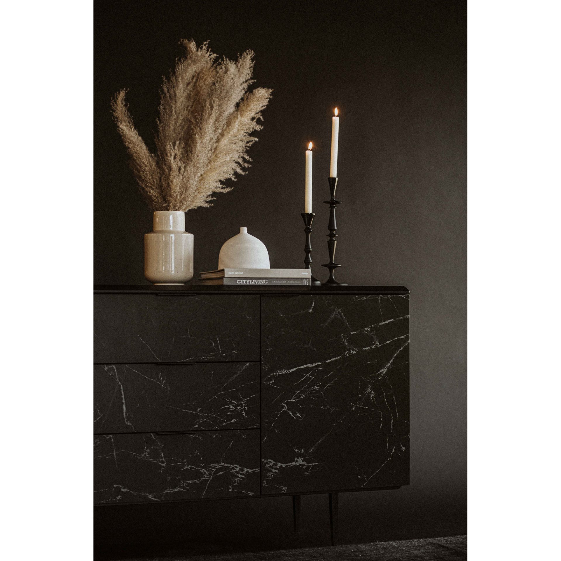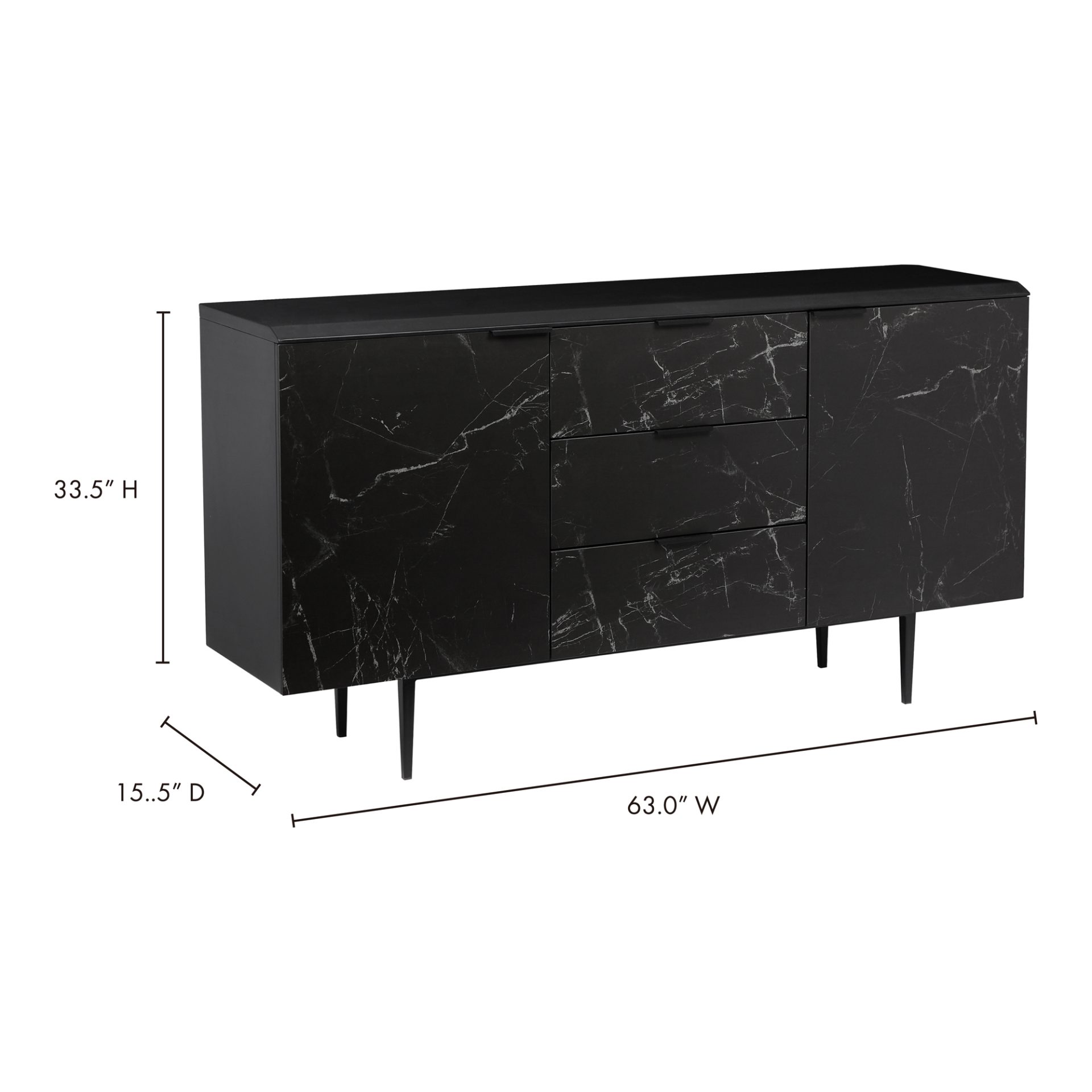 The Medici sideboard highlights flawless form that follows function as a moody storage solution for the dining or living room. With sleek, solid aluminum legs, it features generous storage with four interior shelves plus three deep-set drawers with metal pull-tab hardware. An off to the side center piece, this buffe tis nothing short of stunning. Crafted from high-quality Spanish ceramic, which mimics beautiful marble veining and striations, its matte gloss catches the light just right, emphasizing all of its intricate detailing. Achieve an elegant, timeless balance for your interiors with this contemporary design that inspires style, mood & stillness with its darker palette.