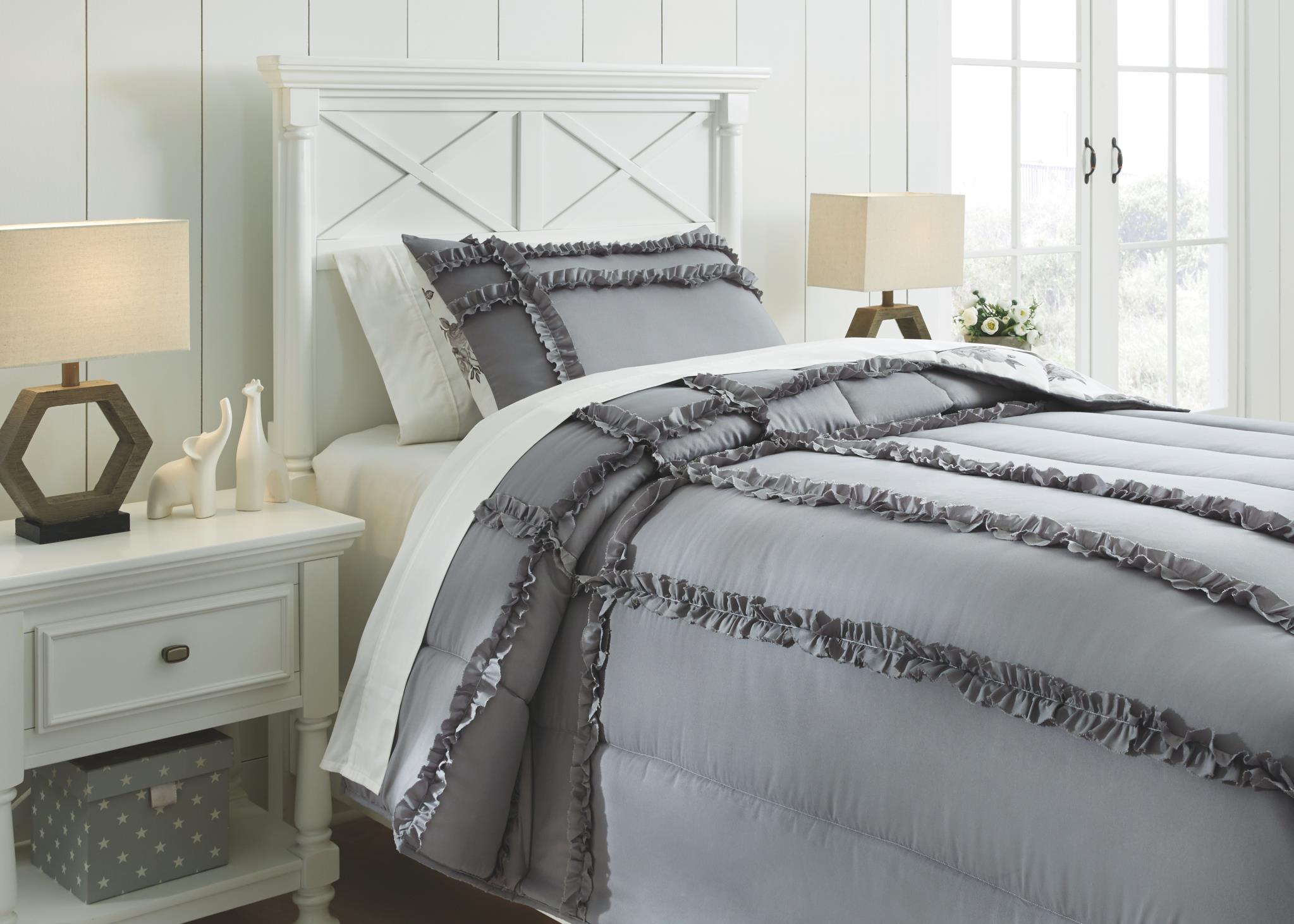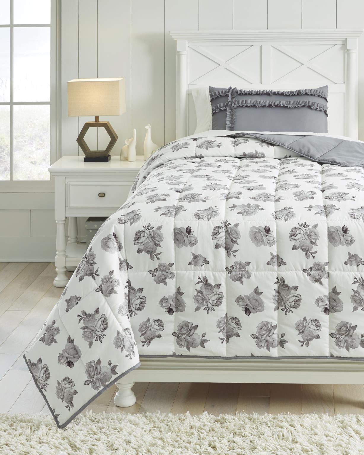 Enticing with a reversible design that pairs a solid gray with a gray and white floral,,,, this twin comforter set is a sweet and feminine choice for your modern farmhouse. Flirty fringe and vertical channel quilting add loads of fabulous texture.