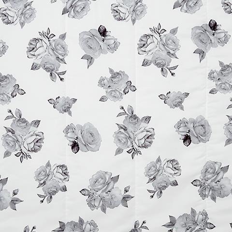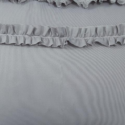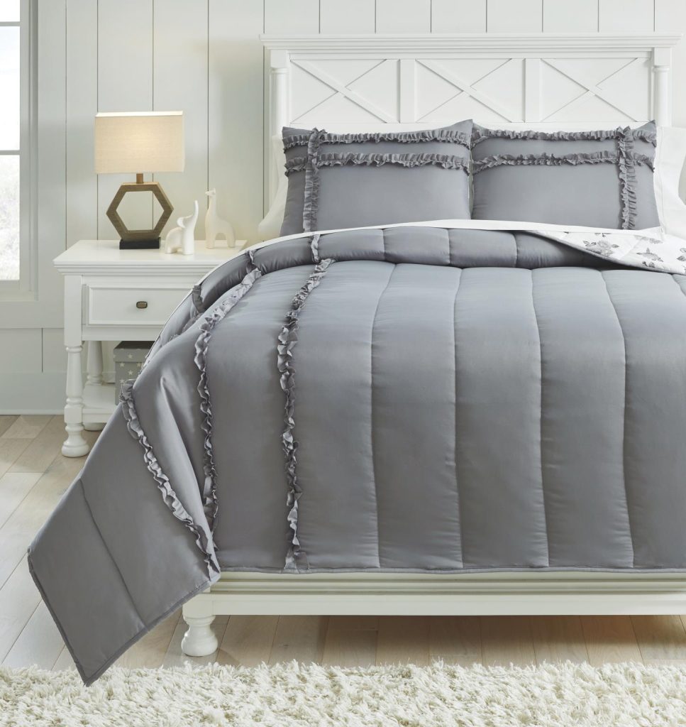 Enticing with a reversible design that pairs a solid gray with a gray and white floral,,,, this full comforter set is a sweet and feminine choice for your modern farmhouse. Flirty fringe and vertical channel quilting add loads of fabulous texture.