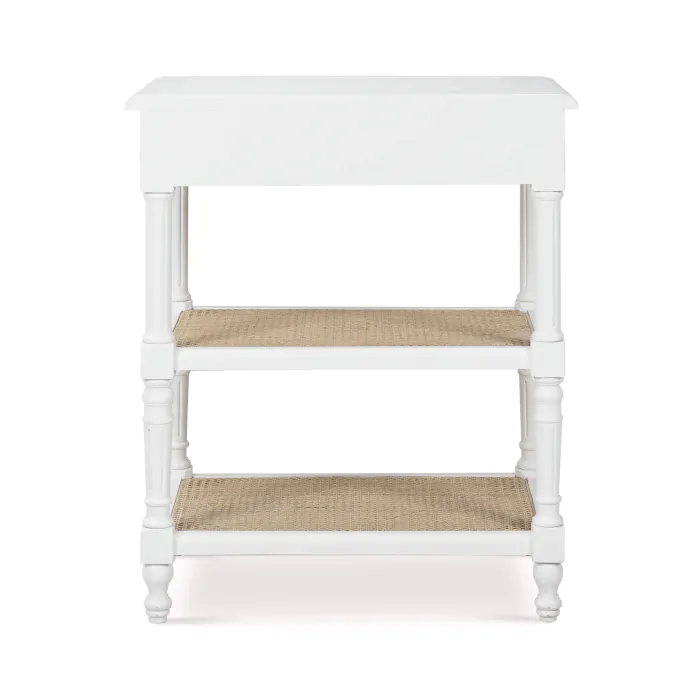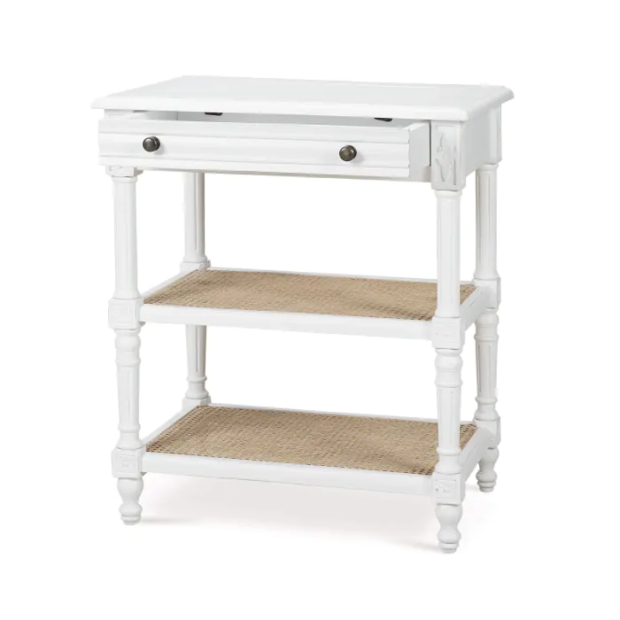 Expand display and storage space while adding a quaint décor element to a vintage-inspired space. Built from solid mahogany, the Melissa Side Table provides drawer storage as well as display space on two open shelves. This piece is offered with a vast array of finish and distress options to create a truly custom design.Architectural White, Rattan Natural, Light Distressed