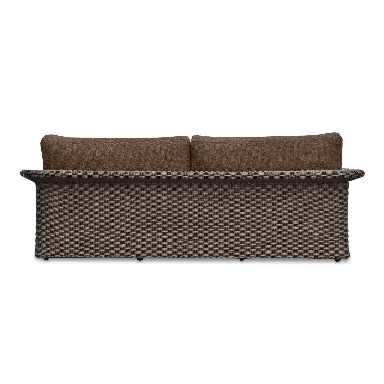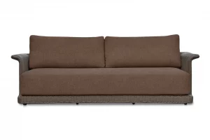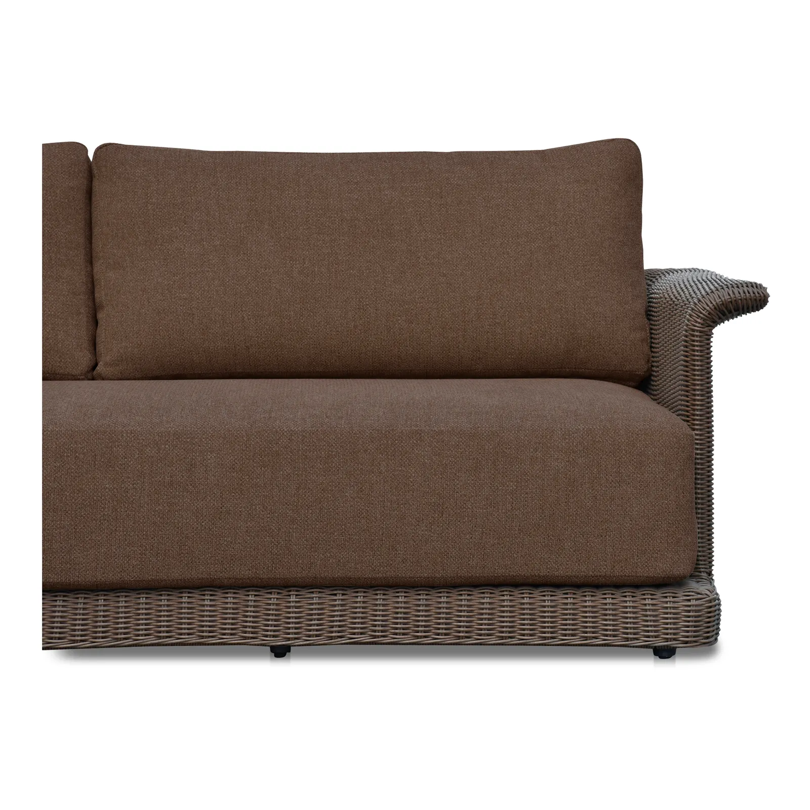 The Meredith sofa’s graceful tulip silhouette and curved armrests create visual interest, while generous cushioning offers indulgent comfort. Artfully woven synthetic wicker over an aluminum frame marries durability with aesthetic appeal. Quick-dry foam and Dacron fiber ensure lasting resilience, while the sophisticated hue complements various exterior designs.