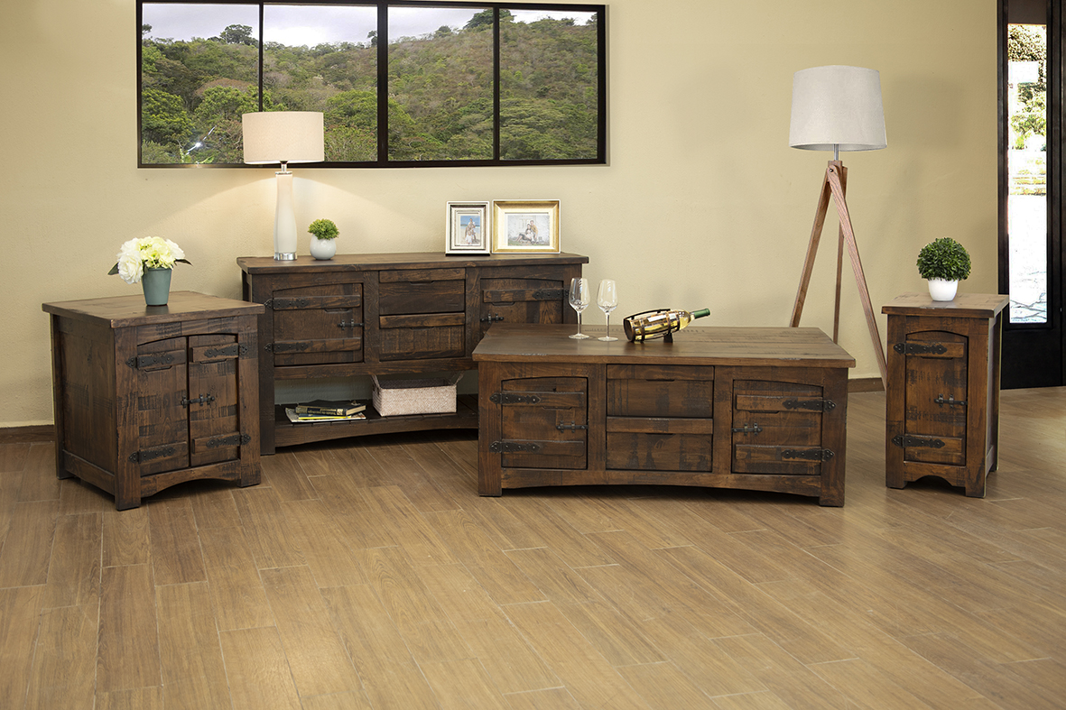 • Inspired by rustic design, the Mezcal Collection is meticulously crafted from solid pine wood and finished in a stunning deep brown tone. This collection showcases small handwrought metal belts that accentuate the natural beauty of the wood.