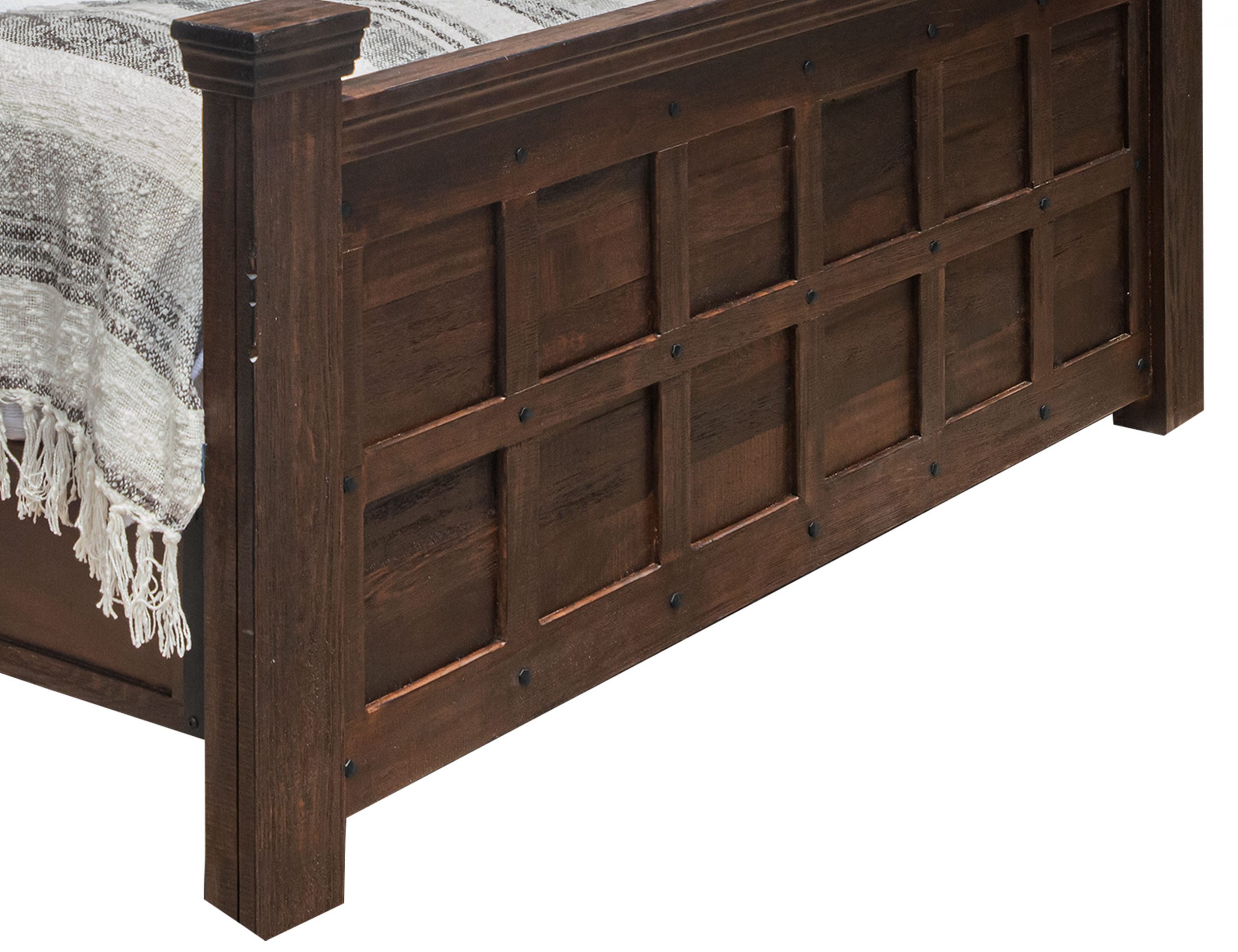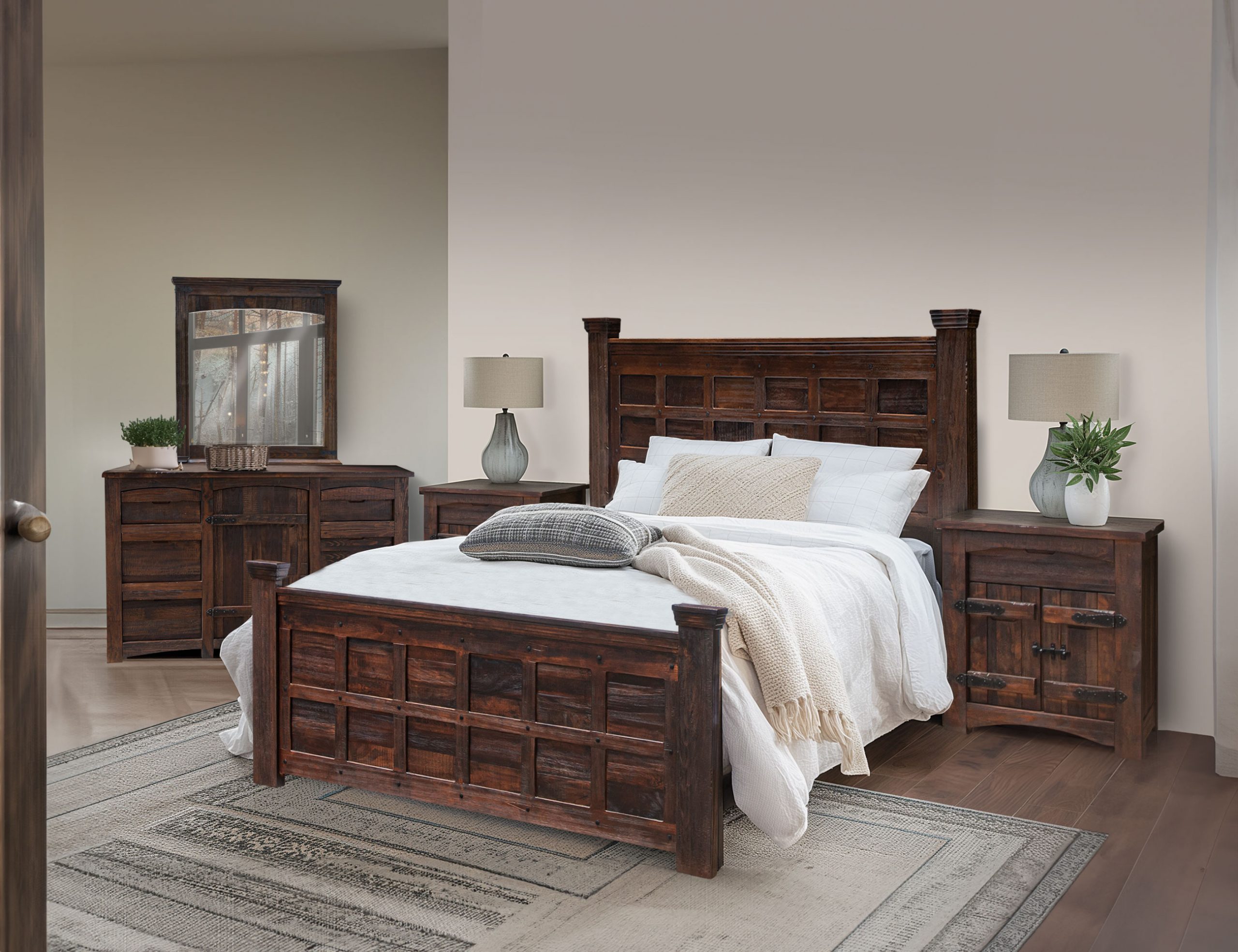 • Inspired by rustic design, the Mezcal Collection is meticulously crafted from solid pine wood and finished in a stunning deep brown tone. This collection showcases small handwrought metal belts that accentuate the natural beauty of the wood.