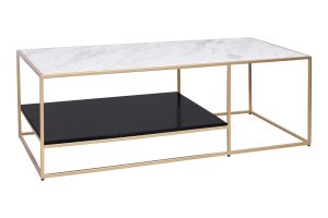 Color, texture and geometry come together with fluid elegance in the Mies coffee table. A sleek affair with a gold-finished iron frame, Mies’ shelves are made of gorgeously contrasting marble. The tabletop is white, the shelf is black, and both are perfectly flattered by the gold frame to create a pleasant call-back to art deco.