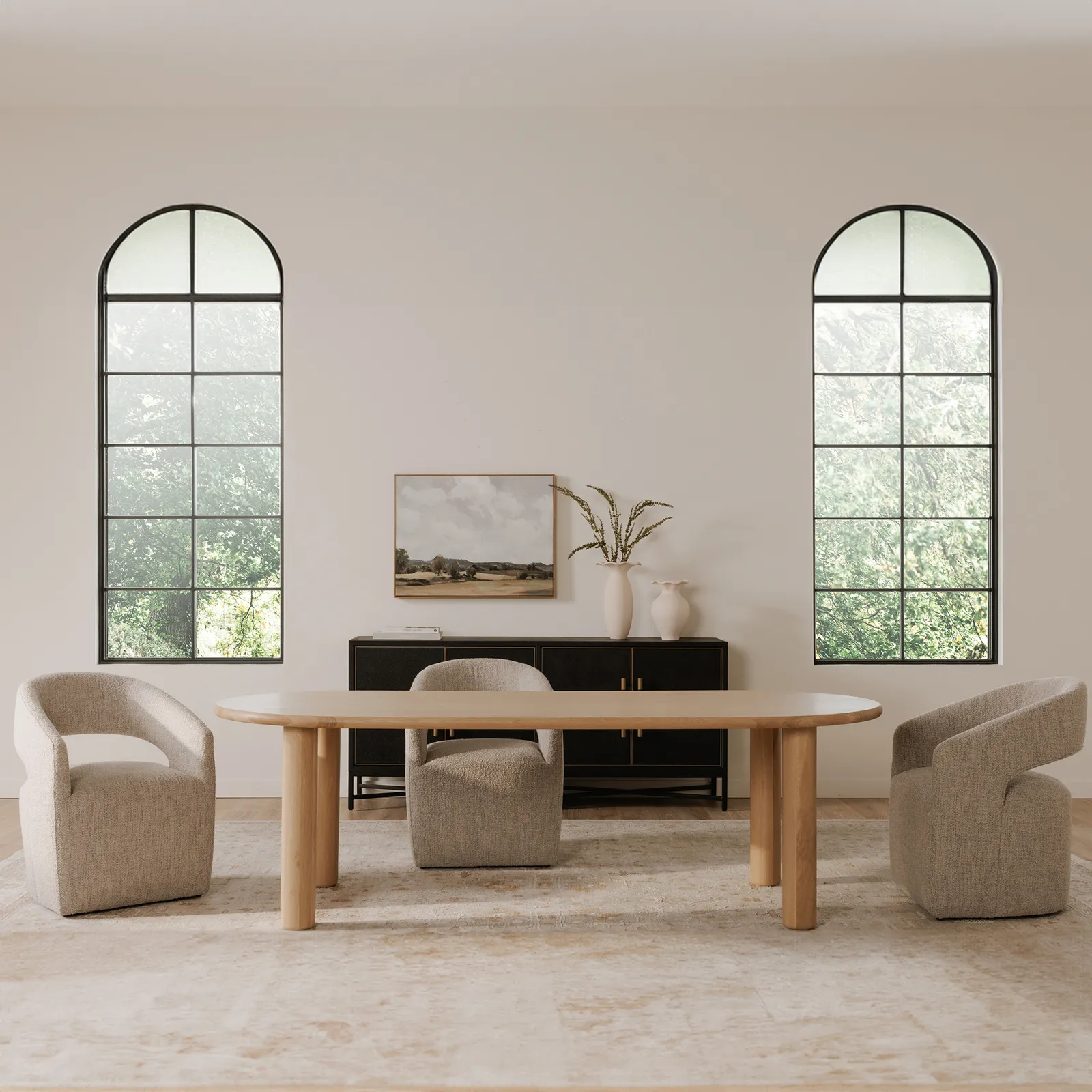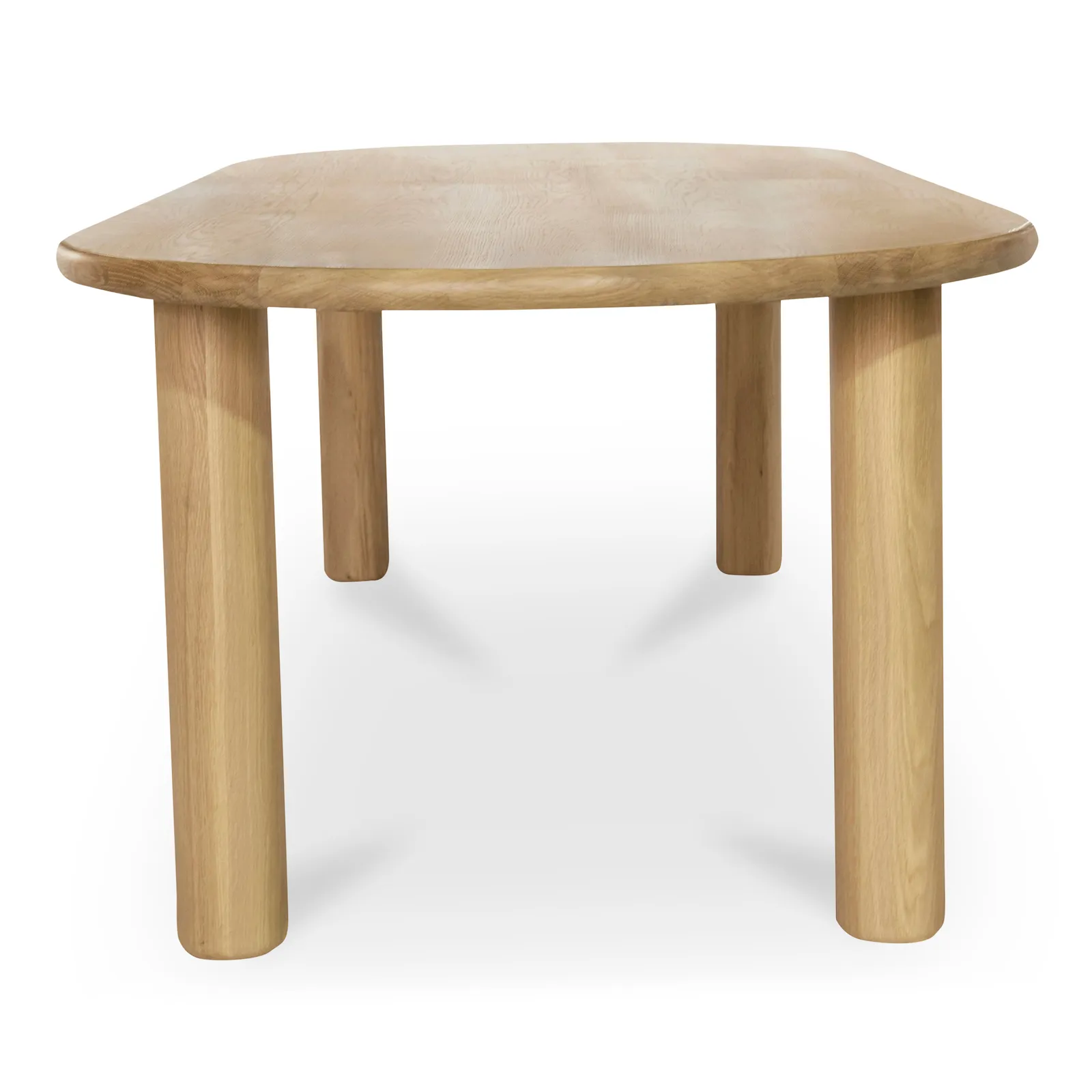 With its thick, rounded edge and sleek column legs, the Milo dining table adds a touch of warmth, comfort and sustainable design. Featuring a light oak finish, this table brings a sense of visual lightness and effortlessly complements various wood tones. Crafted from FSC-certified oak wood and veneer, the Milo showcases exquisite craftsmanship and ensures responsible sourcing from environmentally managed forests.