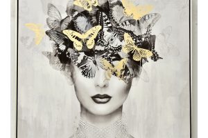 Monarca is a wall painting of elegant class, breathtaking appearance and shrouded mystery. This accent is meticulous in every detail, from the necklace on the woman, to the gold foil embellishments and even the wing patterns. It is a lovely installation of art décor, perfect for any contemporary home.