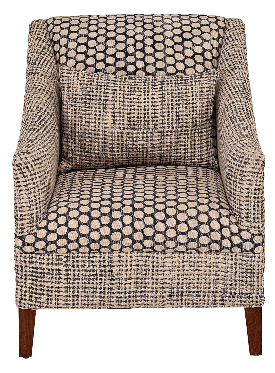 This chair is constructed,, using tongue and groove joint methods,, of mango timber-with exposed legs in a water resistant lacquer sealed warm walnut finish. The upholstery is a striking combination of printed cotton fabrics-and features a loose back pillow and individually tapped decorative nail head trim.