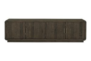 Earthy, on-trend rustic style has been rounded into a minimal silhouette with the Monterey media cabinet. This entertainment cabinet features richly finished pinewood with a matte, driftwood-like finish, blocked base design, and four interior cut-outs for full cable management. With four magnetic catch doors revealing broad storage sections + adjustable interior shelving, this lower storage unit is a rustic knock-out retreat for all your entertainment essentials. A gently curved showcase with a fully finished back, this darkly warming beauty makes for an elegant design off to the side or displayed as a focal point with its confident finish.
