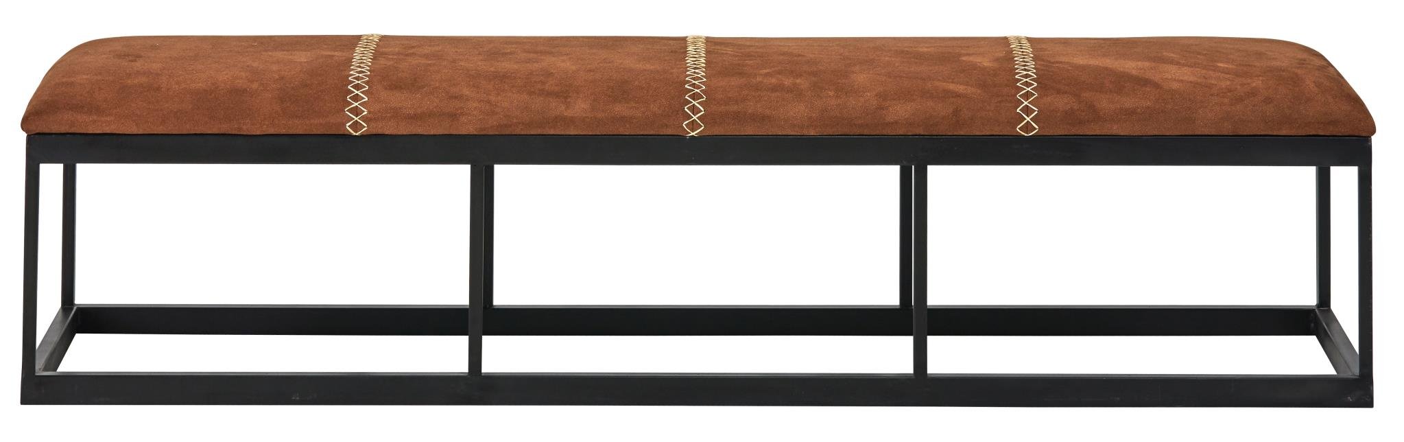 The Moulton benches feature bases constructed,, using MIG welding joint methods,, of iron in a black powder coated finish. The upholstery is polyester suede with decorative “baseball” hand stitching.