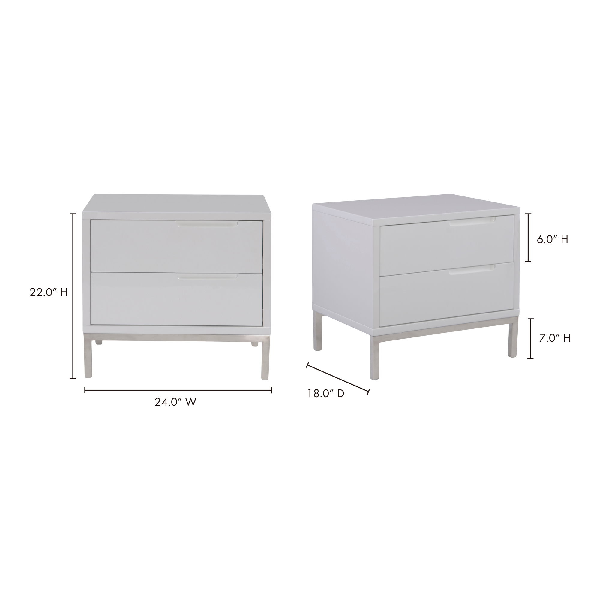 A sleek, modern design lends itself well to the Naples end table. Designed to have a high-gloss lacquer with two soft-close drawers, this brightens up your area without compromising storage space. A polished, stainless steel base is matched to keep it sophisticated.