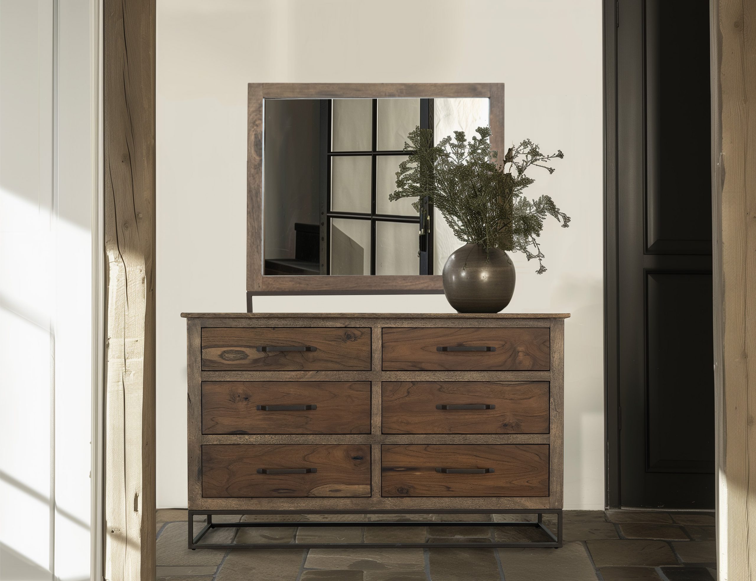 • The Teca collection captures the essence of transitional design by seamlessly blending metal and wood elements. It is meticulously crafted from sustainable mango wood and teak veneer, with a translucent multi-step brown finish.